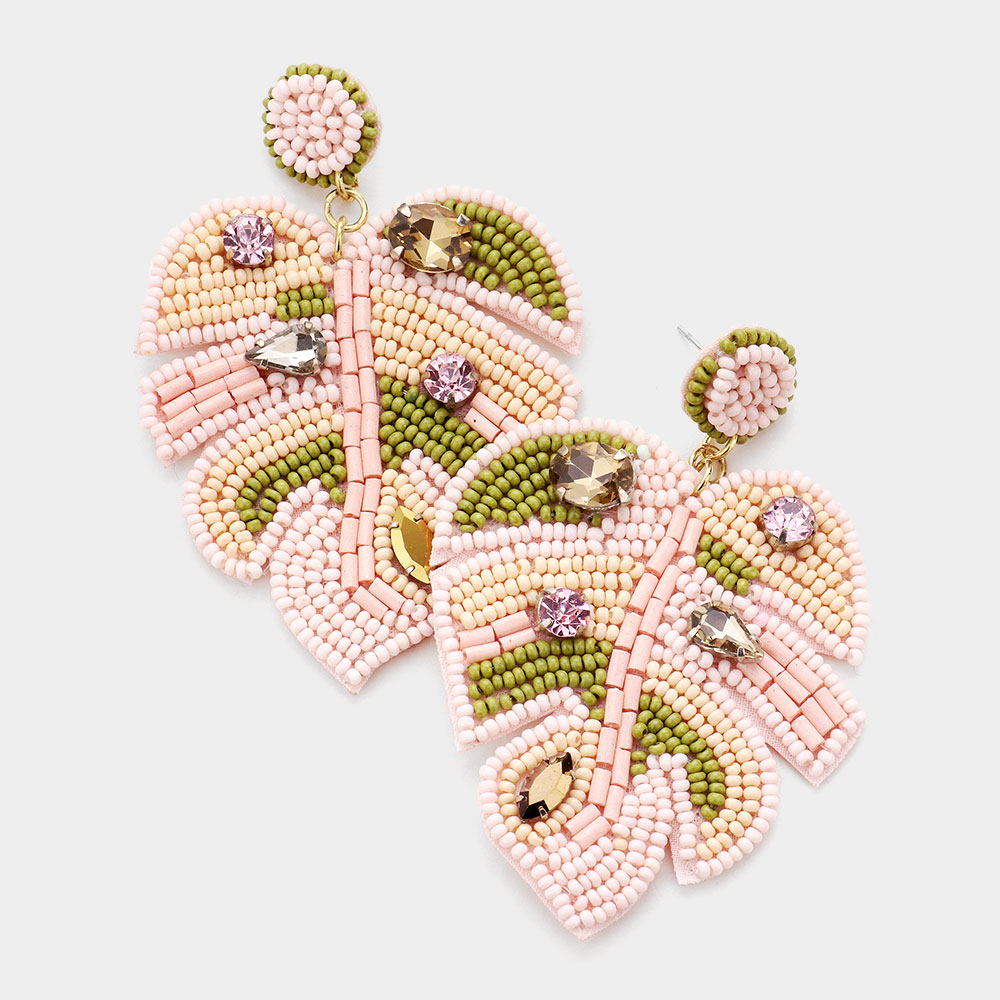 Felt Back Stone Embellished Seed Beaded Tropical Leaf Dangle Earrings