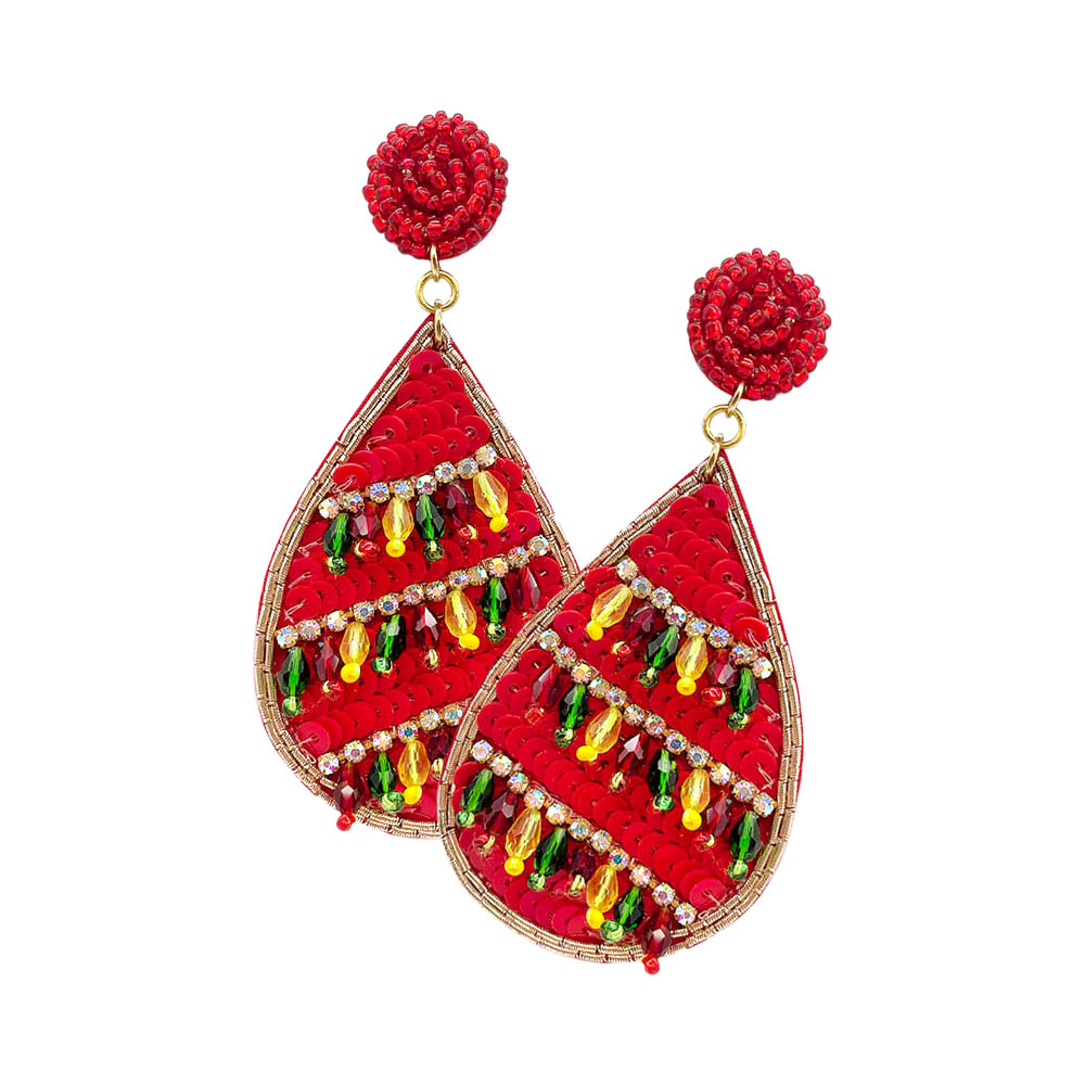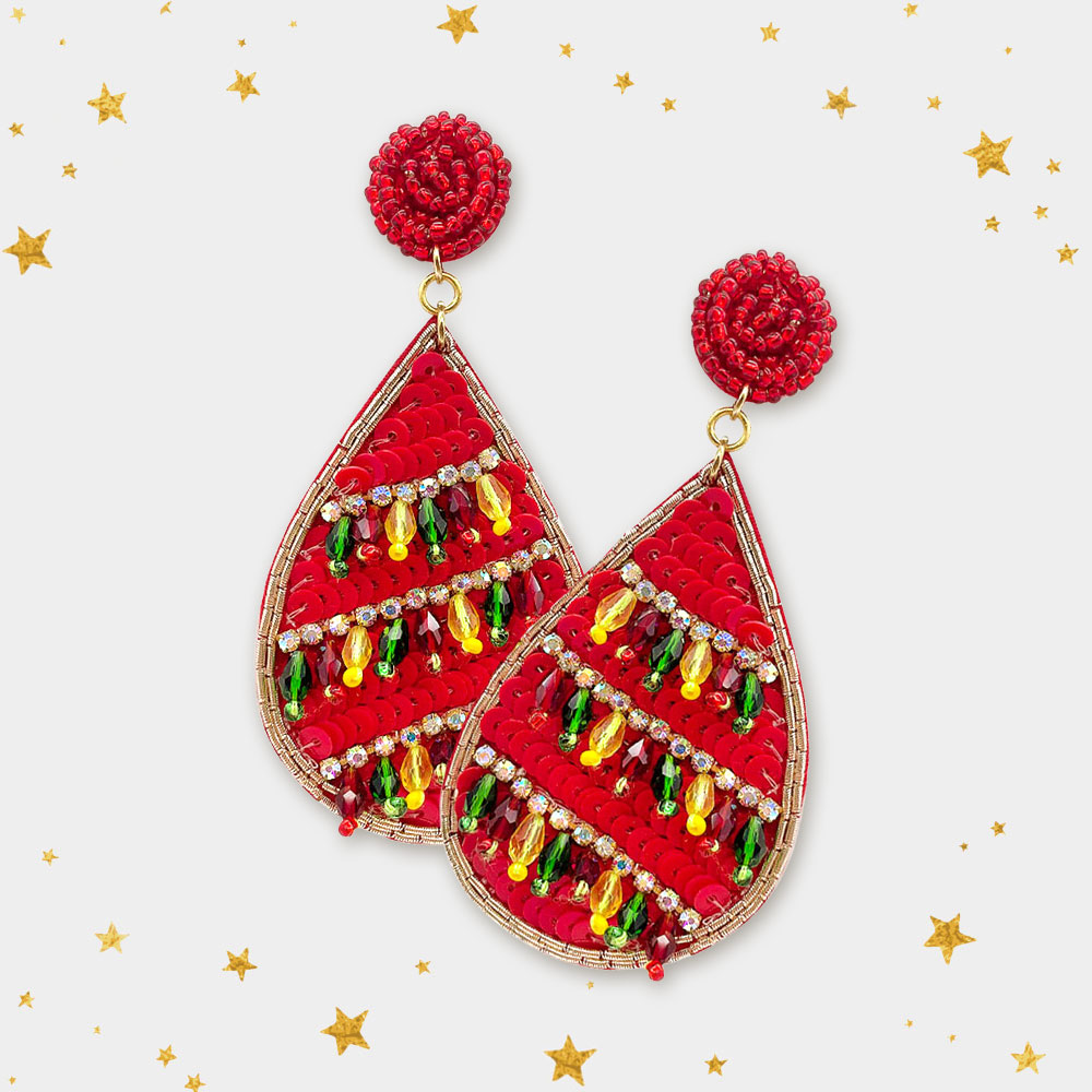 • Statement teardrop earrings with festive beaded stripes and sequin accents. A bold holiday accessory that adds sparkle and cheer to your Christmas party look.