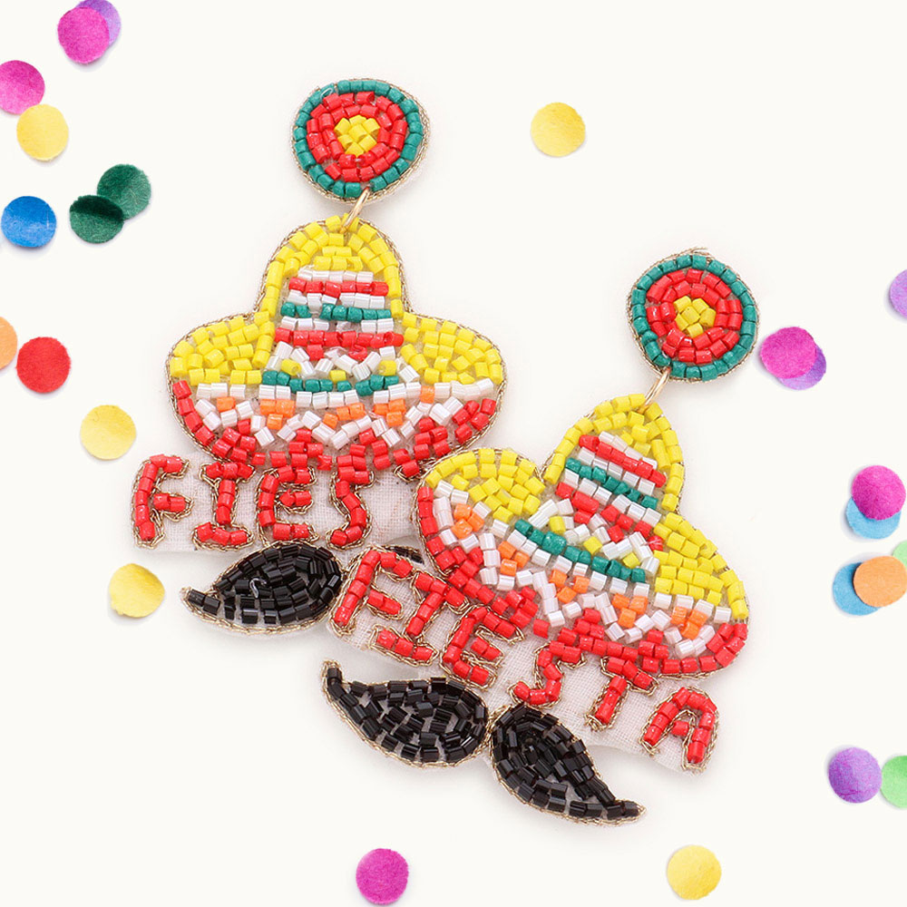 Fiesta Message Felt Back Beaded Hat Mustache Dangle Earrings
