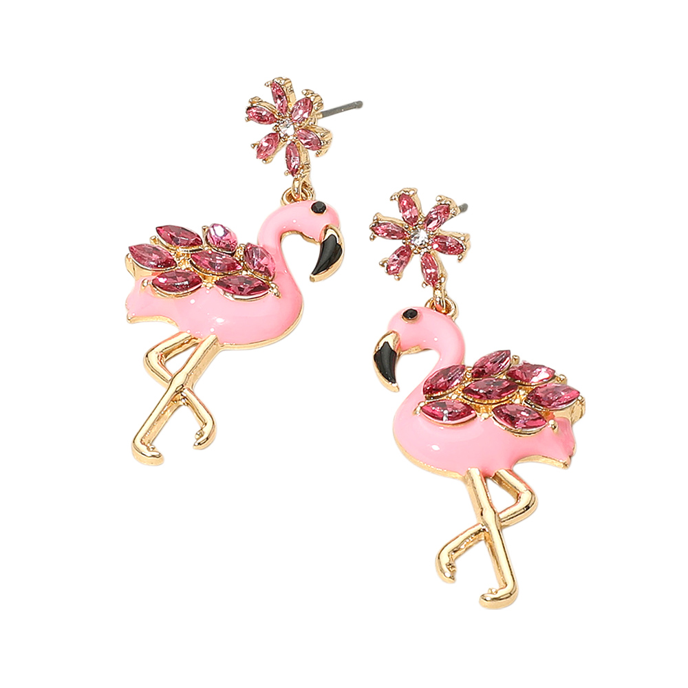 Details • Size : 0.75" X 2.1' • Post Back • Bring a splash of fun to your style with these crystal flamingo drop earrings, featuring gemstone accents and playful floral studs. Perfect for parties, summer outings, or vacation looks, these earrings add vibrant charm and sparkle to any cheerful ensemble. • Lead and Nickel Compliant