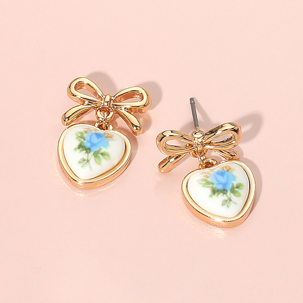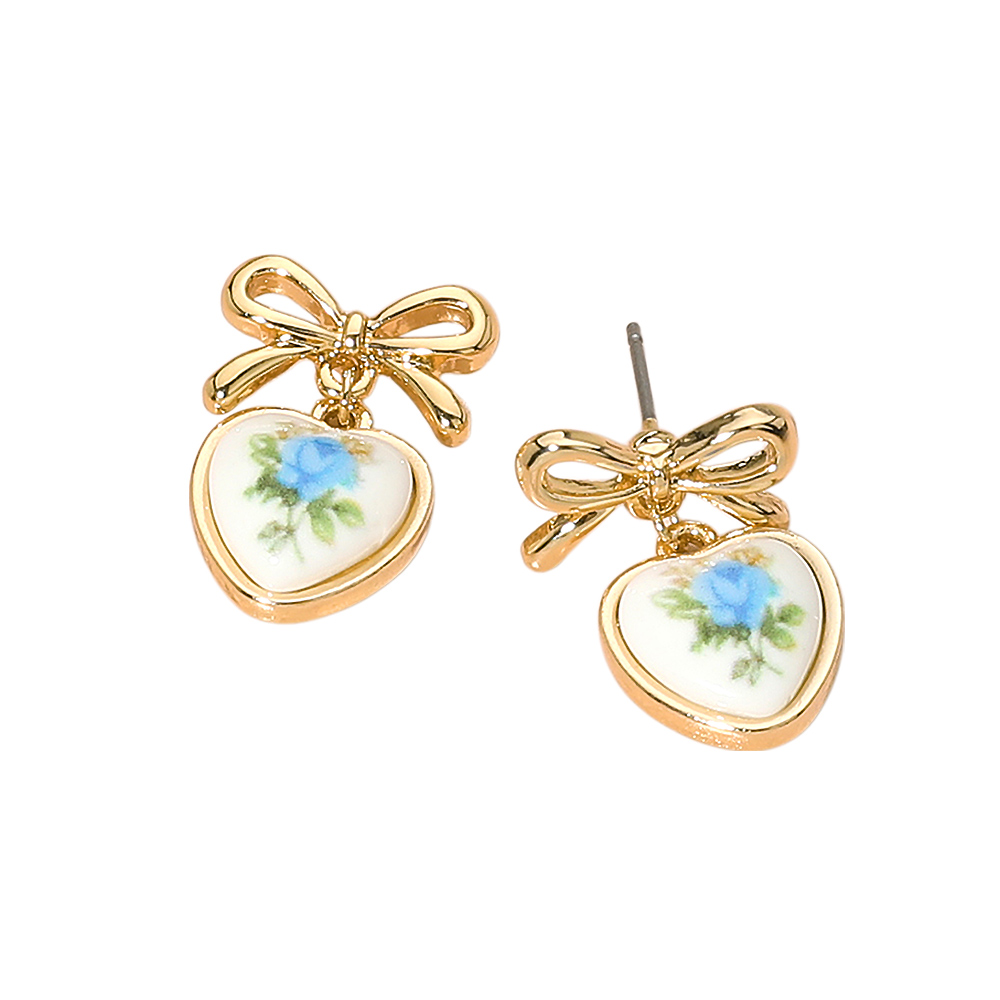 Floral Heart Ceramic Bezel Dangle Bow Earrings