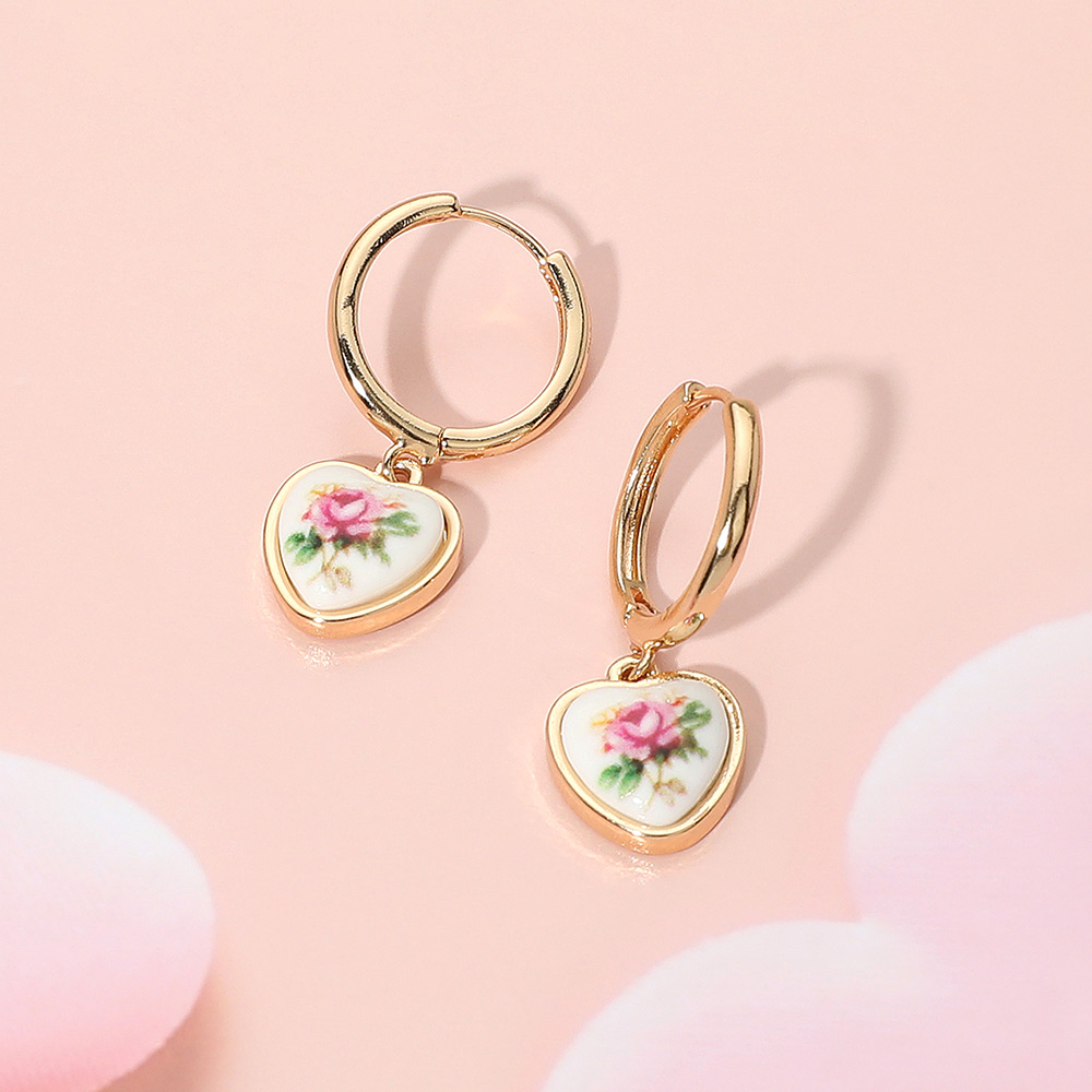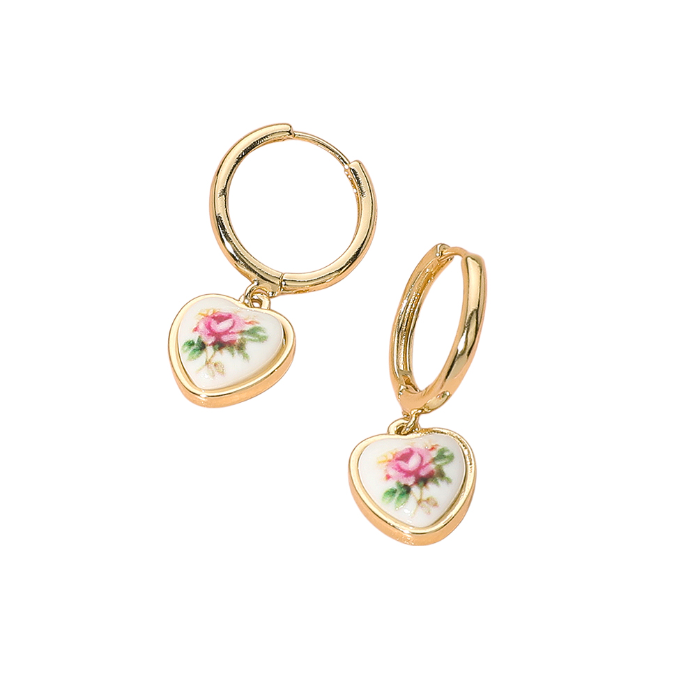 • Delicate hoop earrings featuring heart-shaped porcelain charms with floral detail. A graceful blend of vintage charm and modern elegance, perfect for everyday wear or special occasions.