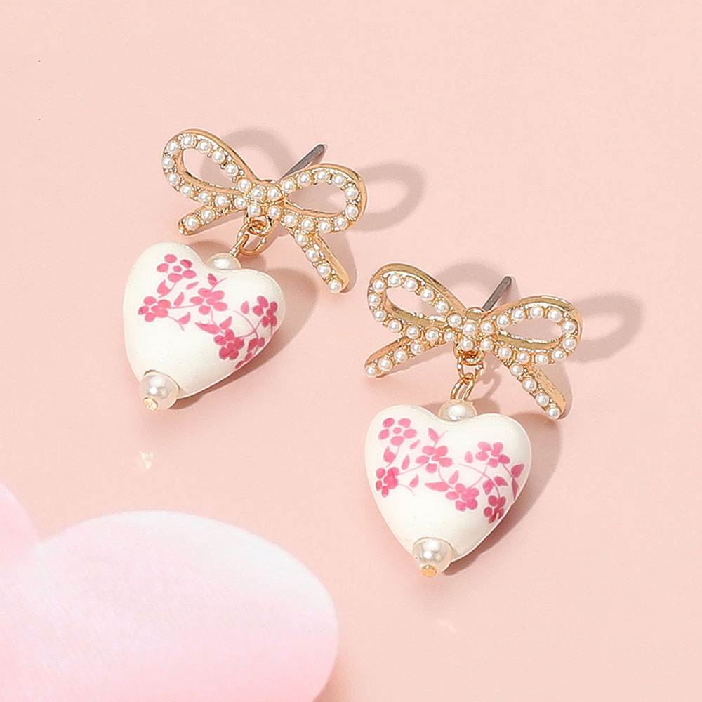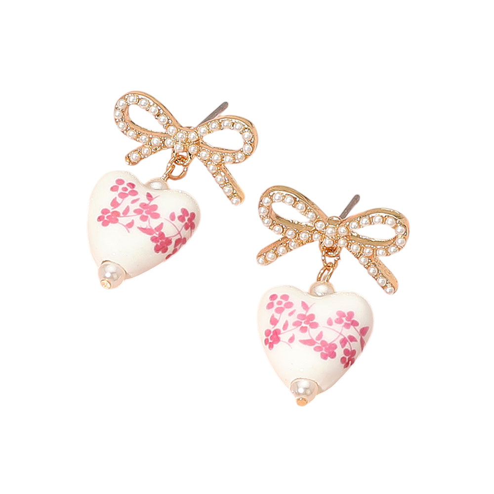 Details • Size : 0.6" X 1.3" • Post Back • Charming drop earrings featuring heart-shaped porcelain pieces with floral design, pearl tips, and rhinestone-studded bows—perfect for adding romance and elegance to your style. • Lead and Nickel Compliant