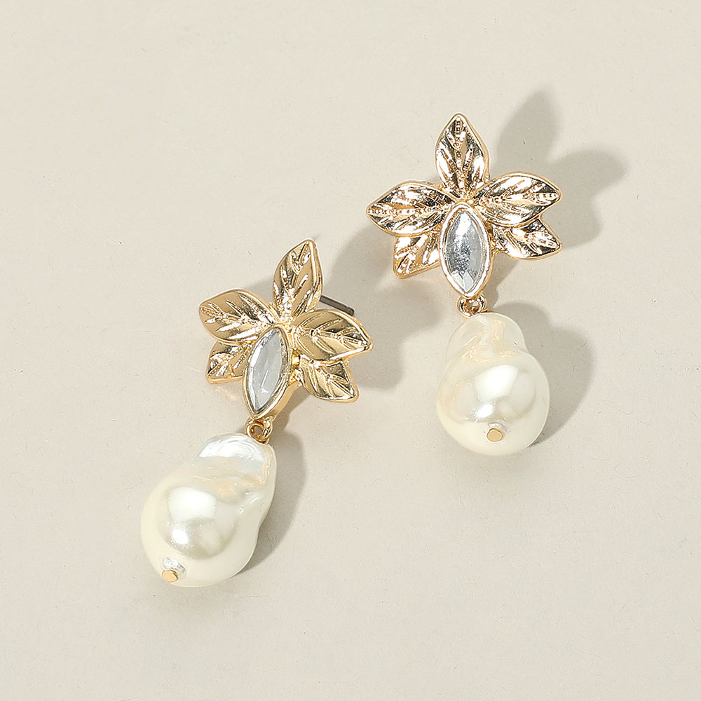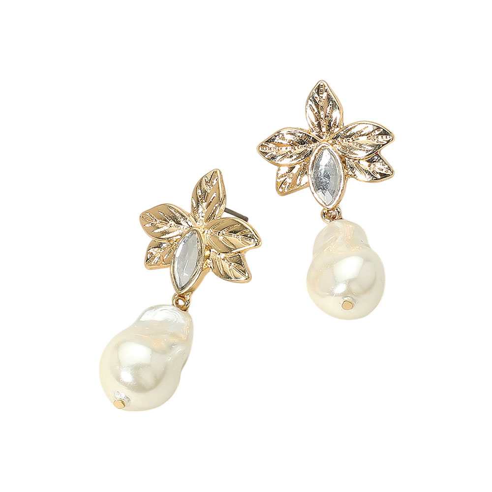 Details • Size : 0.9" X 1.75" • Post Back • Elegant drop earrings featuring a detailed leaf design with a sparkling crystal accent and a unique imitation pearl dangle, ideal for refined and feminine looks. • Lead and Nickel Compliant