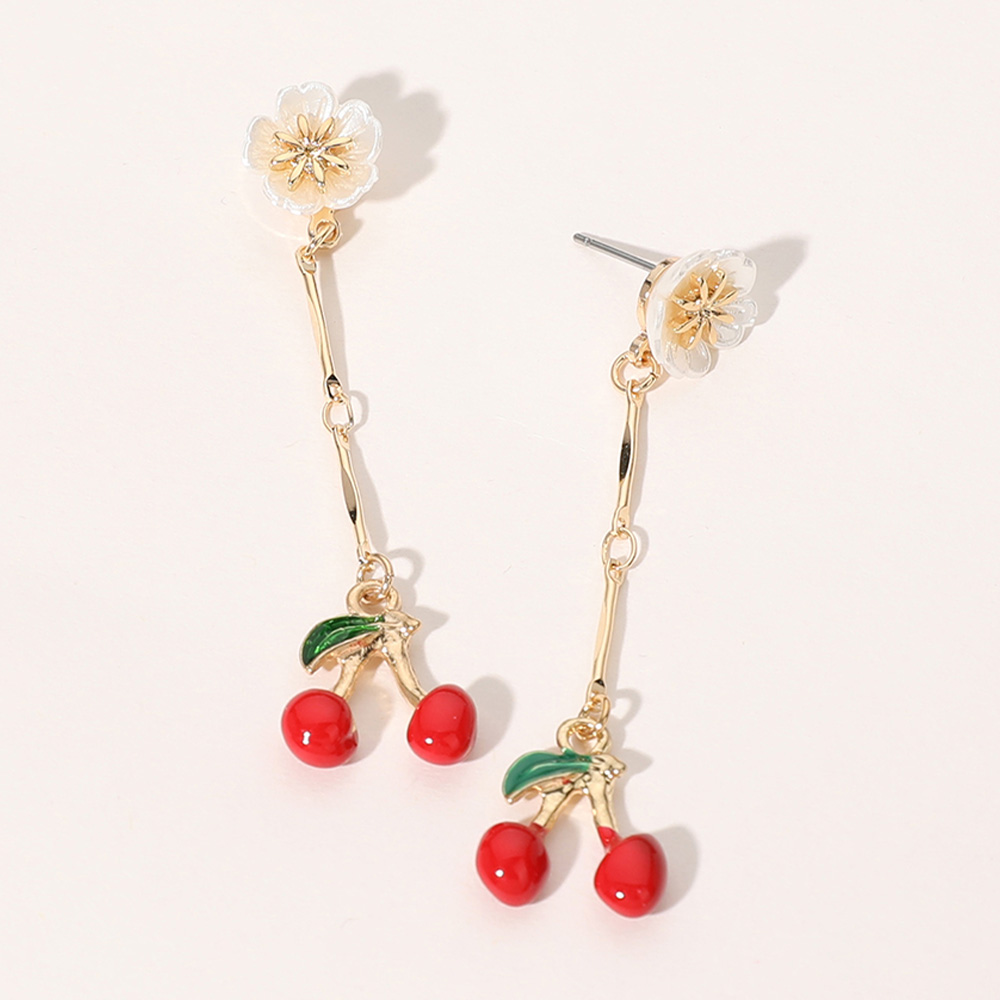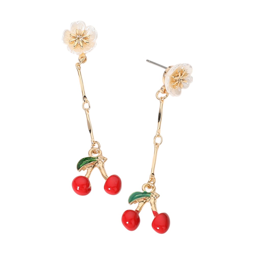 • Elegant drop earrings featuring cherry charms and a floral stud top. A graceful accessory that adds playful charm and seasonal flair to your everyday or evening ensemble.