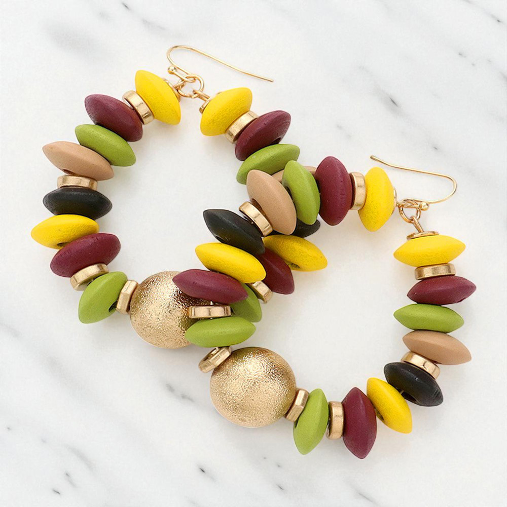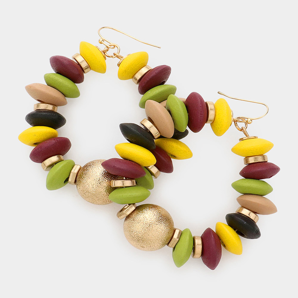 Frosted Metal Ball Accented Wood Beaded Open Circle Dangle Earrings