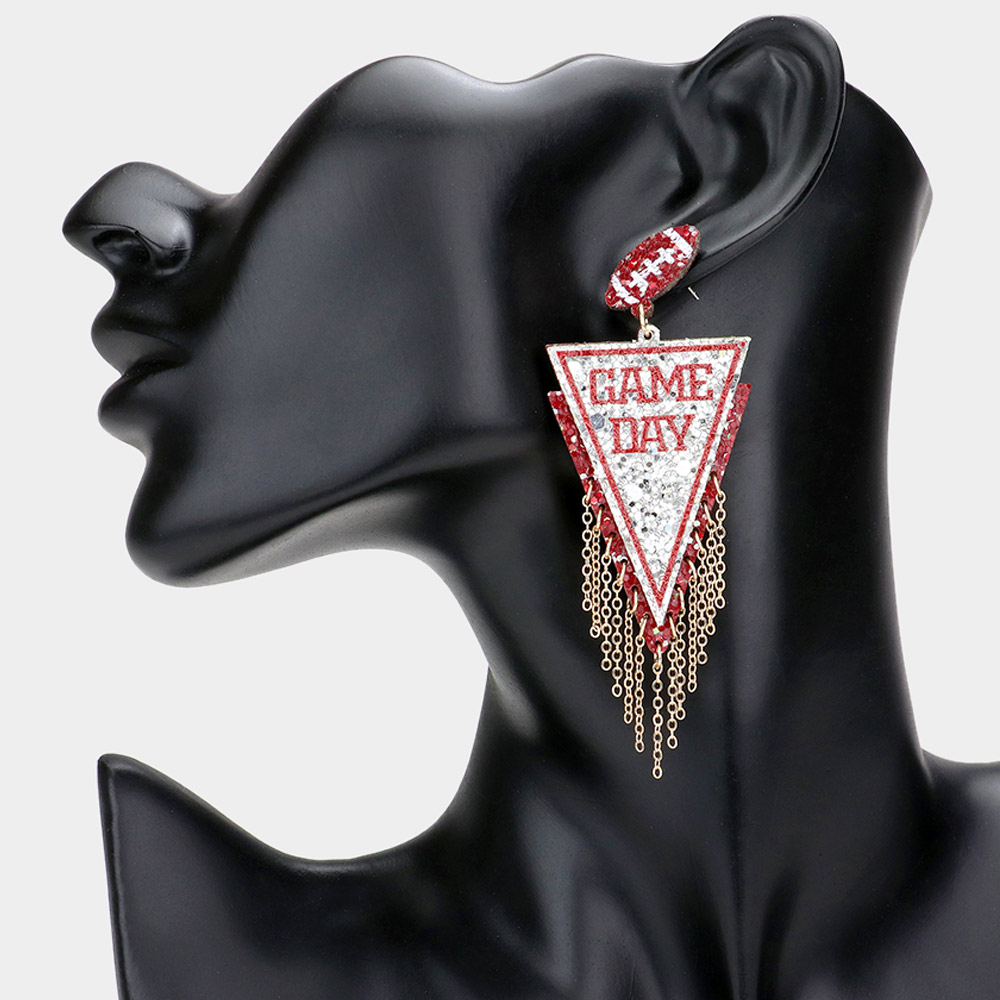 Details • Size : 1.25" X 3.75" • Post Back • Celebrate team spirit with these gameday triangle drop earrings featuring bold lettering, vibrant accents, and flowing tassel chains. Perfect for tailgates, sports parties, and cheering in the stands, these statement earrings bring energy, style, and festive flair to every outfit. • Lead and Nickel Compliant