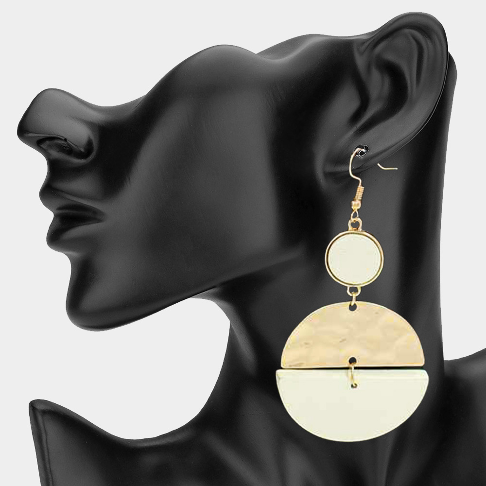 Details • Size : 1.6" X 3" • Fish Hook Back • These bold two-tone dangle earrings feature a geometric blend of circular and half-moon shapes, offering a striking contrast and a contemporary look. Lightweight and statement-making, they add modern flair to any outfit and transition seamlessly from day to night wear. • Lead and Nickel Compliant