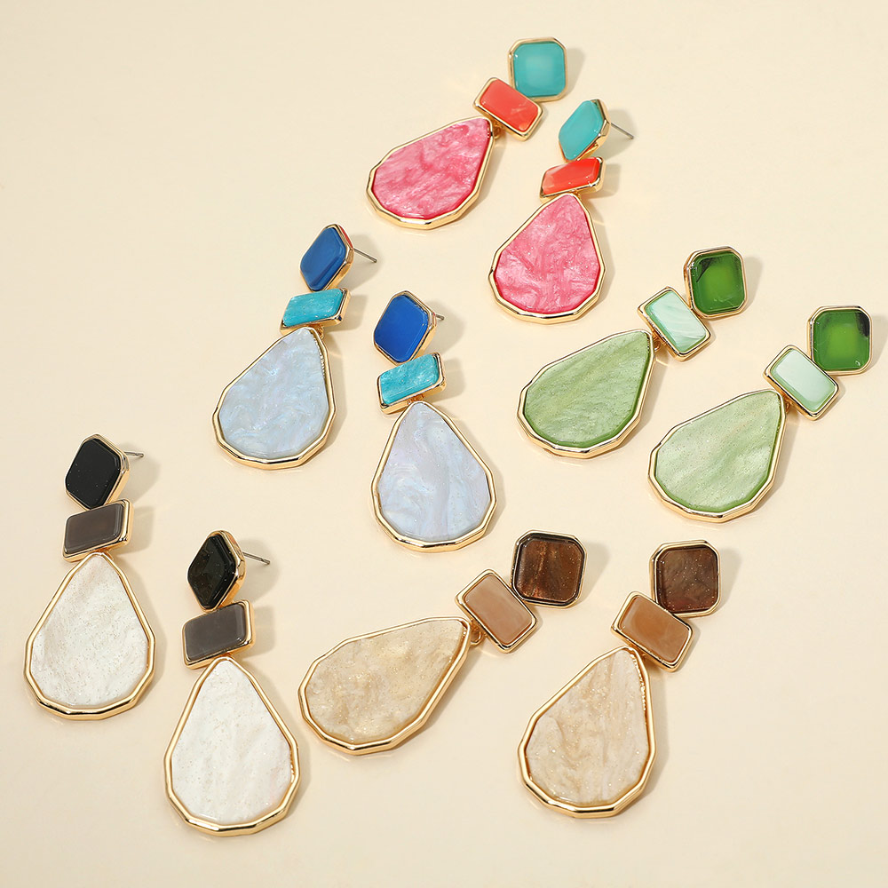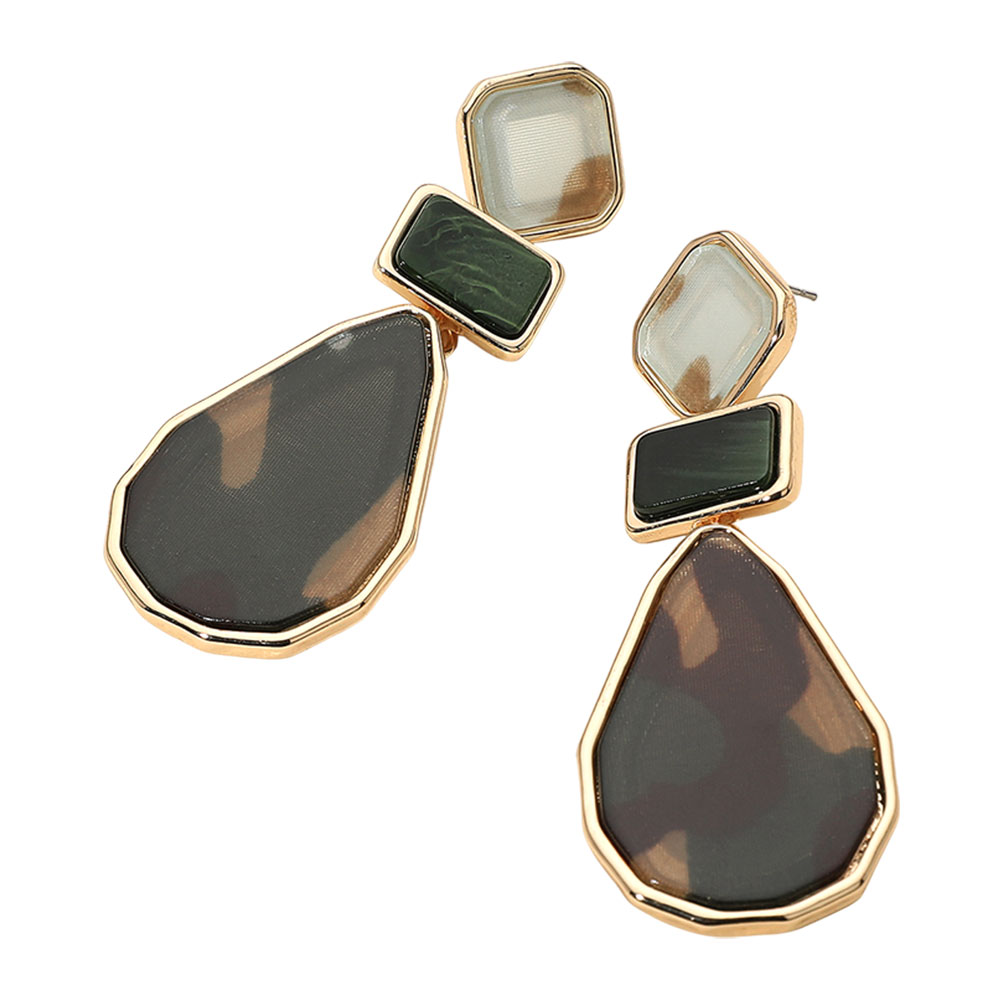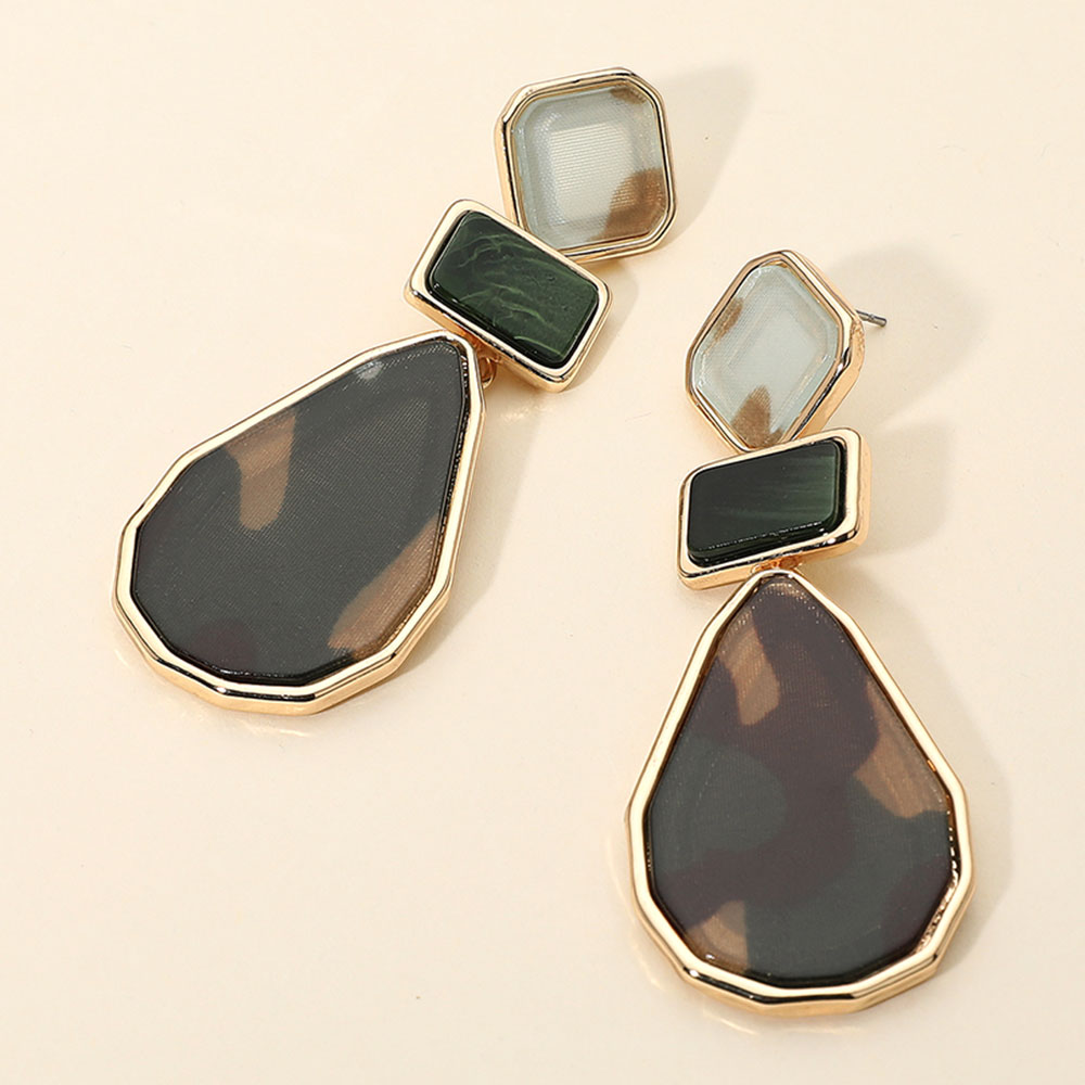 Details • Size : 1.1" X 2.9" • Post Back • Bold geometric drop earrings featuring layered shapes with glossy accents. These statement earrings combine modern artistry with timeless elegance, perfect for parties, evening wear, or elevating everyday outfits. Lightweight and stylish, they add a contemporary touch to any look. • Lead and Nickel Compliant
