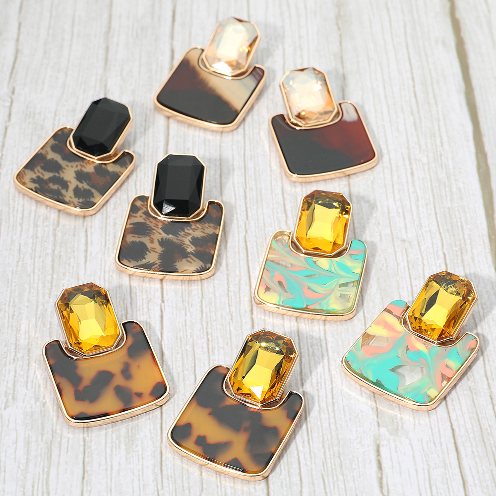 Details • Size : 1.5" X 2.1" • Post Back • Stand out with these geometric gemstone stud earrings featuring a striking print accent on resin plate. The bold contrast between faceted stones and patterned detail creates a chic, fashion-forward look—perfect for adding a statement touch to both casual and elegant outfits. • Lead and Nickel Compliant