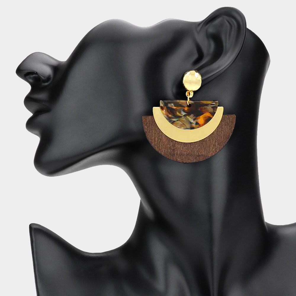 Geometric Wooden Metal Resin Layered Fan Plate Dangle Earrings