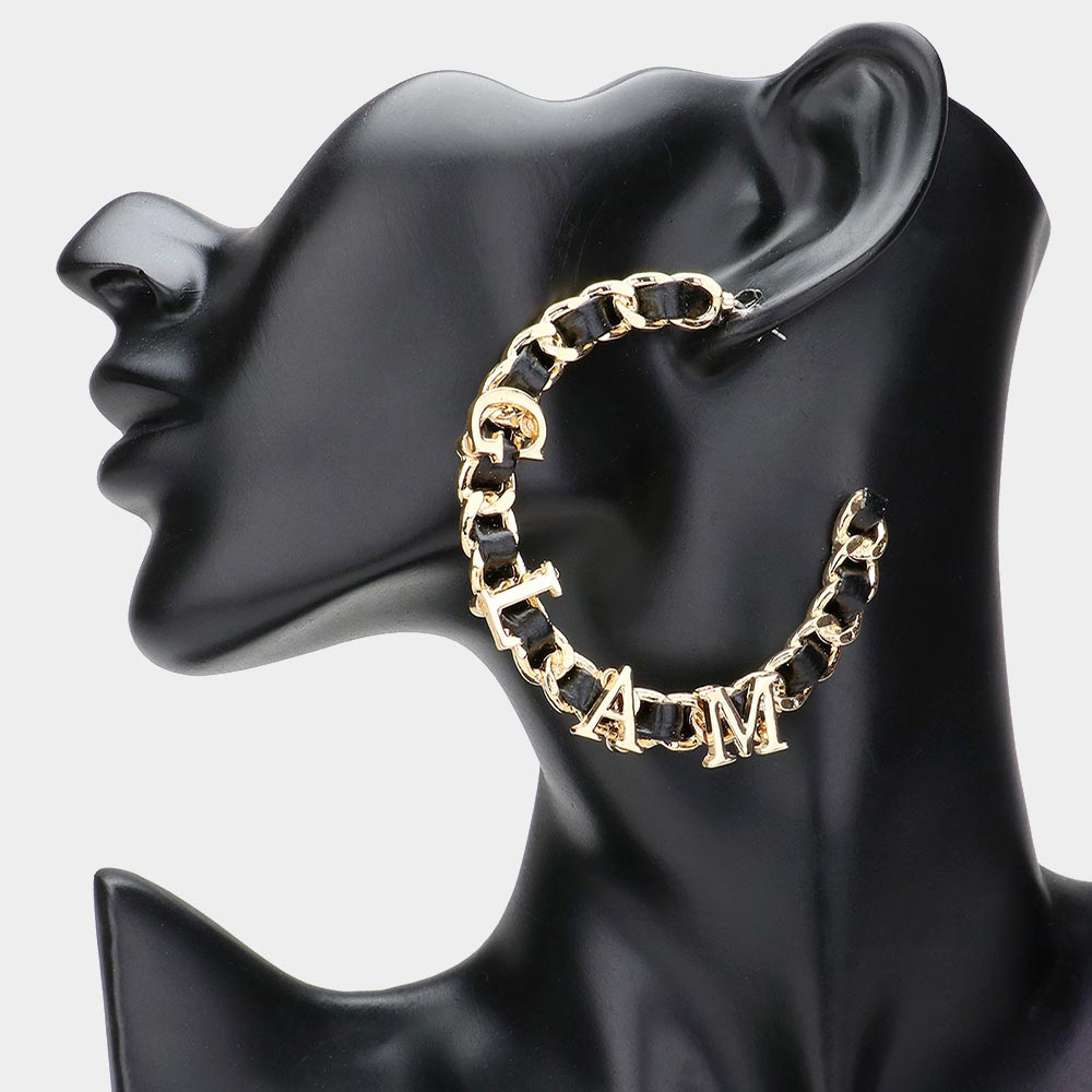 Glam Message Faux Black Leather Metal Chain Hoop Earrings