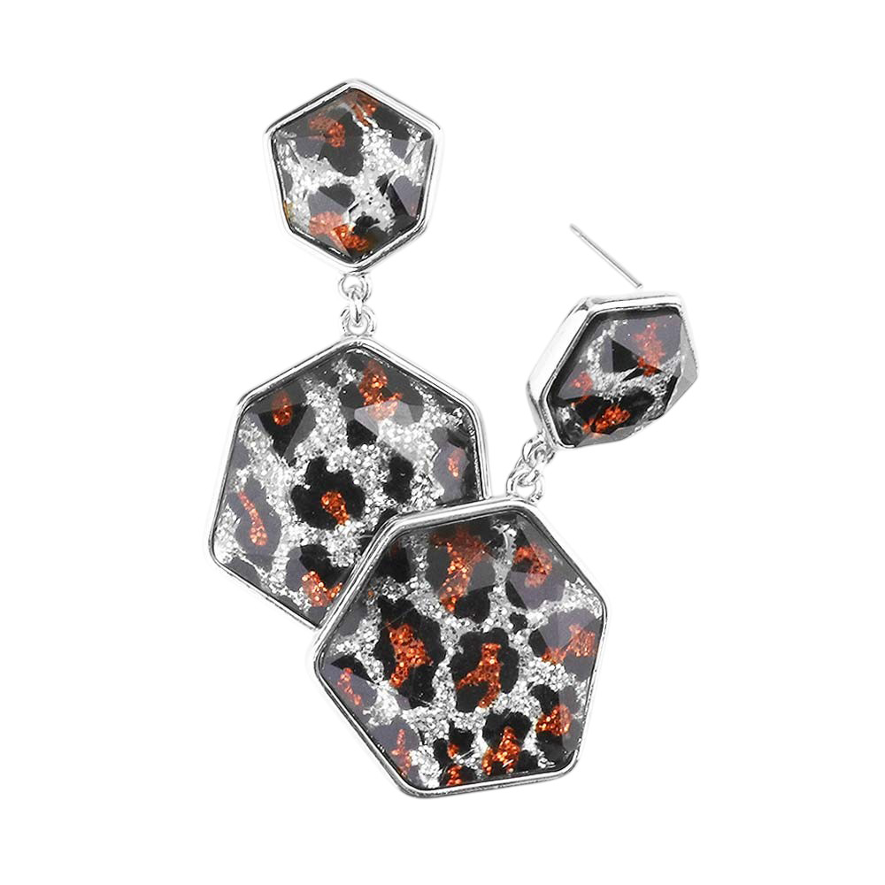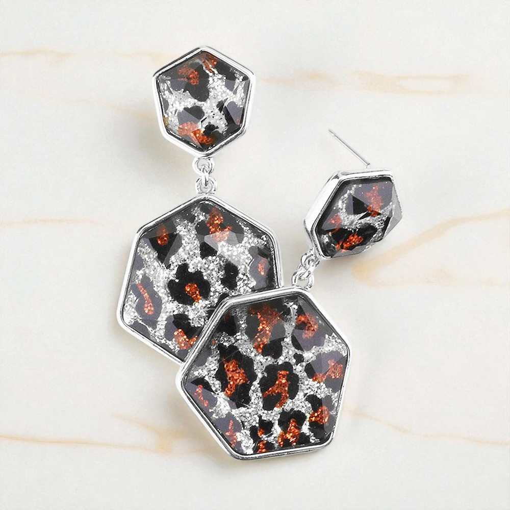 Glitter Leopard Double Hexagon Bead Link Earrings