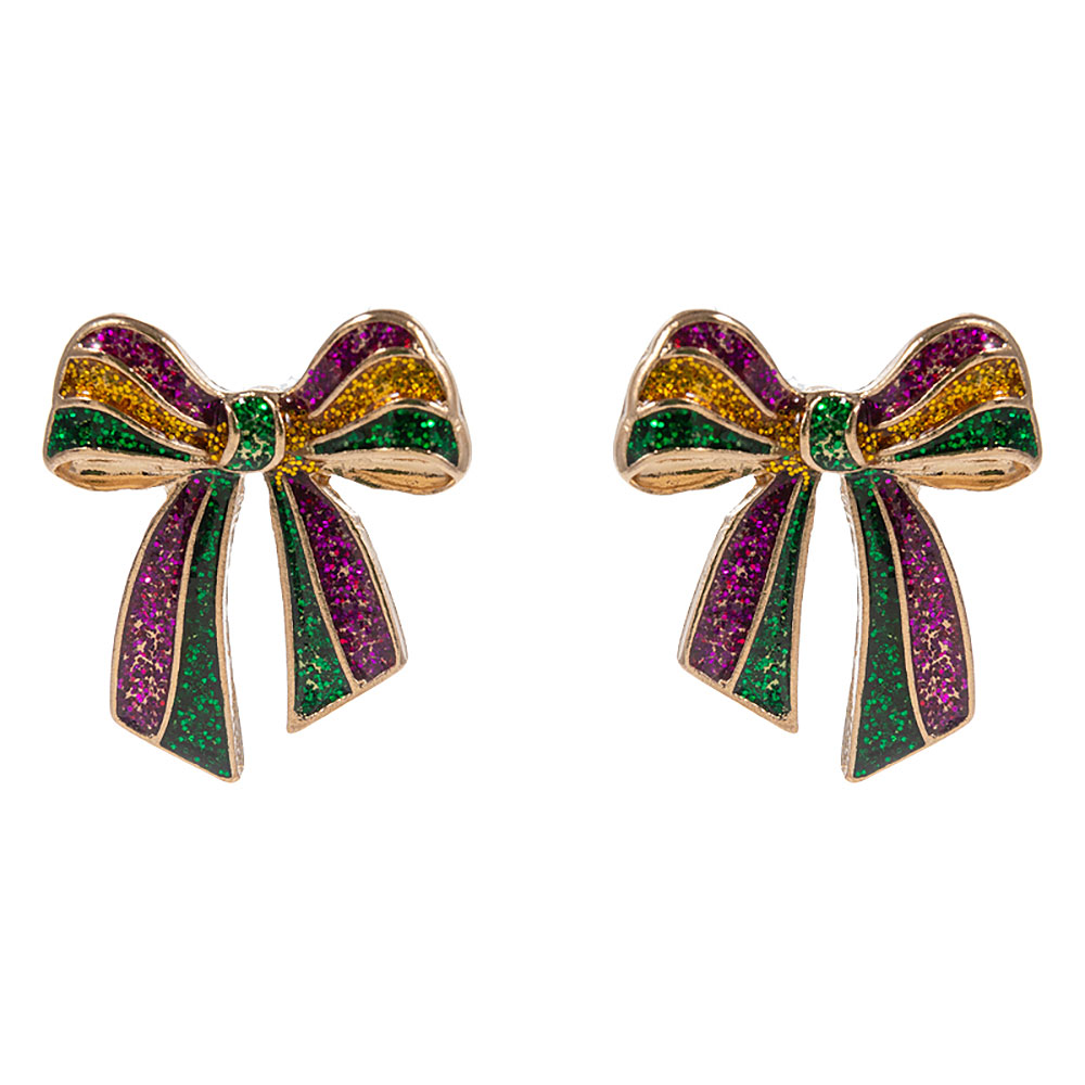 Details • Size : 0.8" X 1" • Post Back • Add a touch of sparkle to your festive look with these glitter bow stud earrings. Their elegant shape and dazzling finish make them the perfect accent for parties, parades, or special celebrations, bringing charm and playful sophistication to any outfit. • Hypoallergenic • Lead and Nickel Compliant