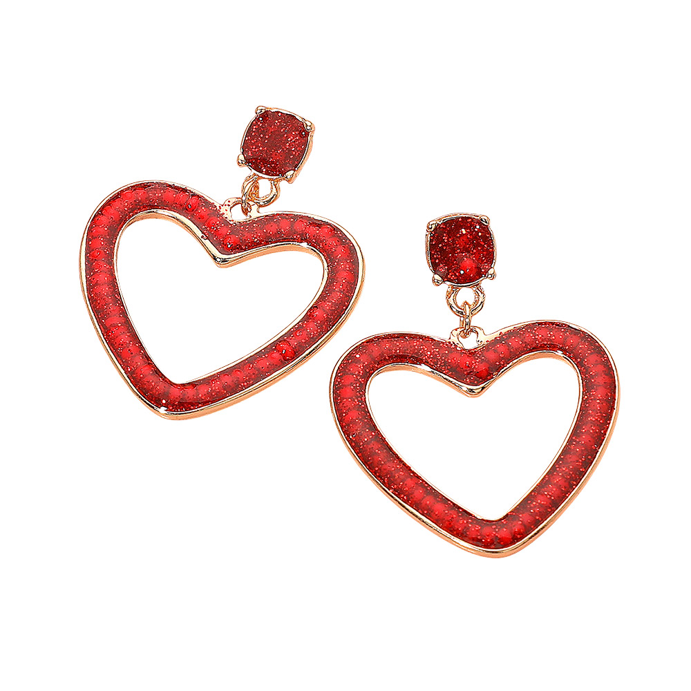 Details • Size : 1.25" X 1.7" • Post Back • Lightweight open-heart dangle earrings featuring a glittery accent finish and a bold drop-heart design. A stylish statement accessory ideal for gifting or adding a touch of sparkle to everyday and special-occasion looks. • Lead and Nickel Compliant