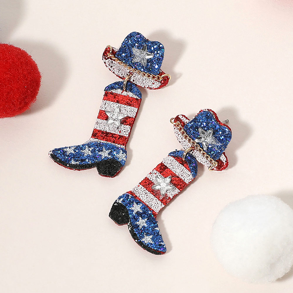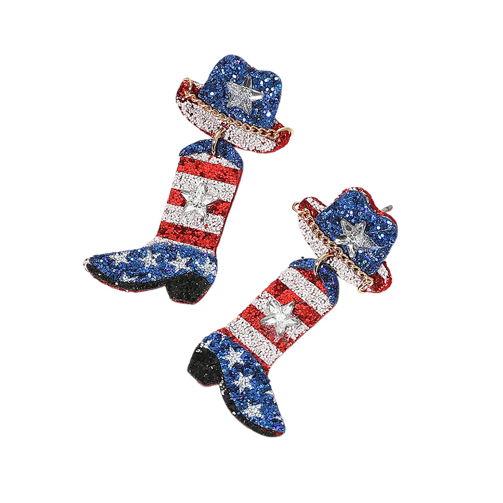 Glittered American USA Flag Western Hat Boot Dangle Earrings