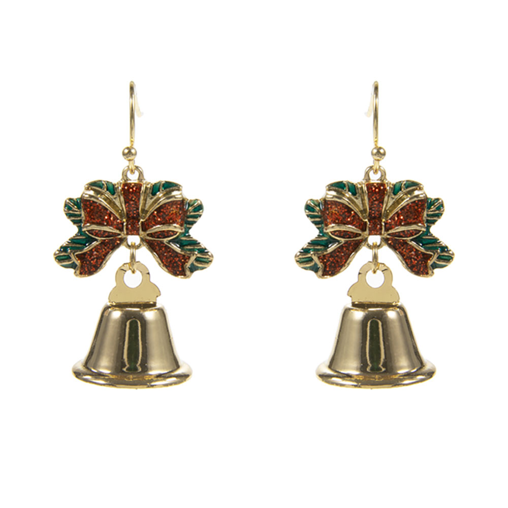 Details • Size : 0.8" X 1.6" • Brass Fish Hook Back • Add festive sparkle with these holiday bell earrings, featuring a glitter-accented bow and shiny metallic bell drop. Ideal for Christmas parties, seasonal events, or gifting, these lightweight earrings deliver a charming and classic holiday look with every wear. • Lead and Nickel Compliant • Hypoallergenic