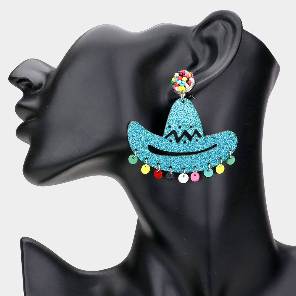 • Bold sombrero statement earrings designed with playful glitter details and colorful bead accents. Perfect for themed parties, festive events, or making a fun fashion statement. Lightweight and eye-catching, they bring personality and charm to any outfit for a unique, standout accessory look.