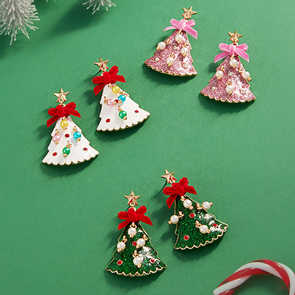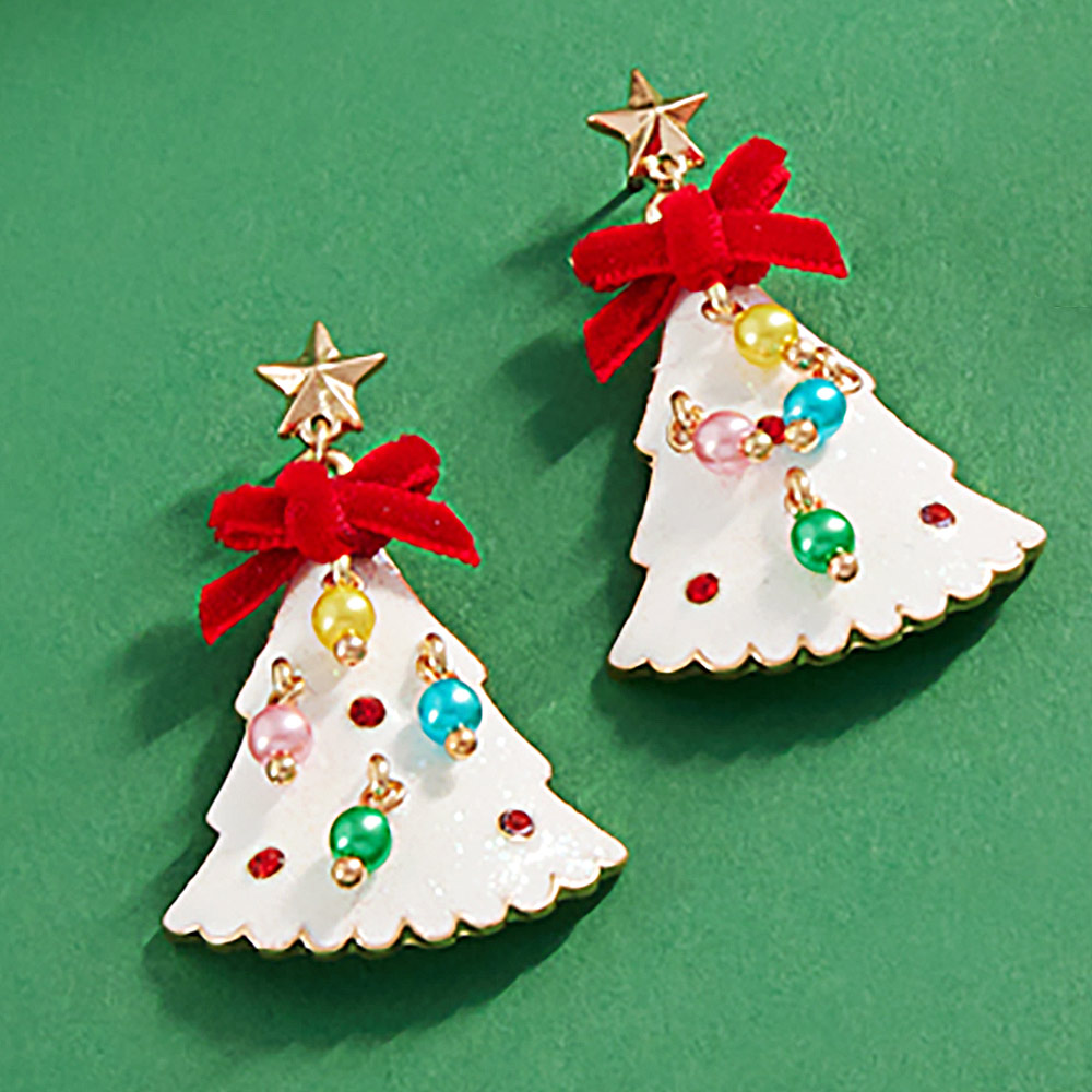 • Celebrate the season with whimsical Christmas tree drop earrings, accented with colorful beads, star tops, and charming bow details. A fun and festive accessory to enhance your holiday style.