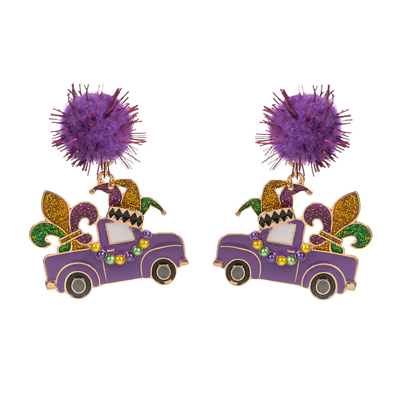 Glittered Enamel Mardi Gras Truck Dangle Pom Earrings