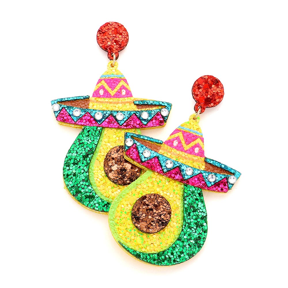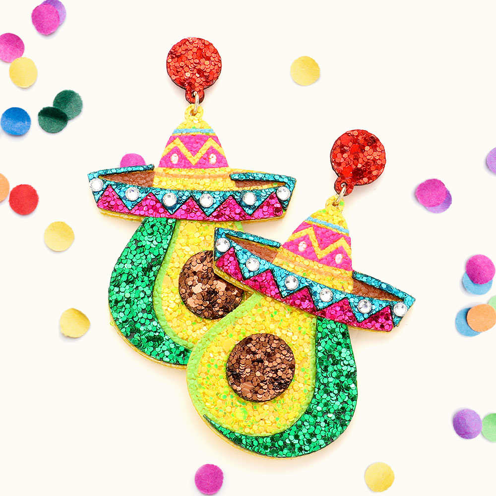 Glittered Hat Mustache Pointed Lime Cocktail Link Dangle Earrings