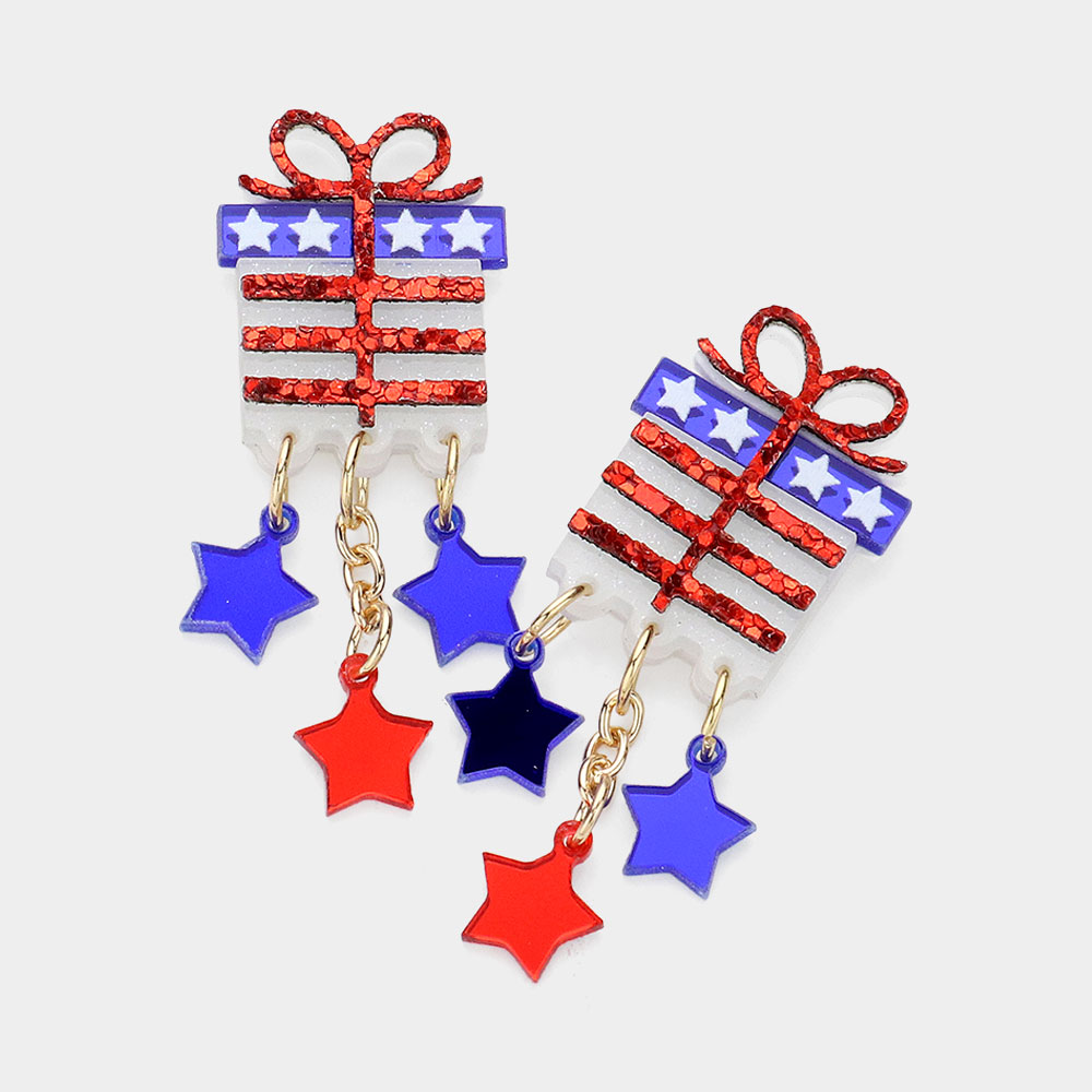 Glittered Resin American USA Flag Gift Box Dangle Earrings