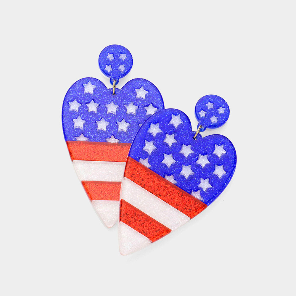 Glittered Resin American USA Flag Heart Dangle Earrings
