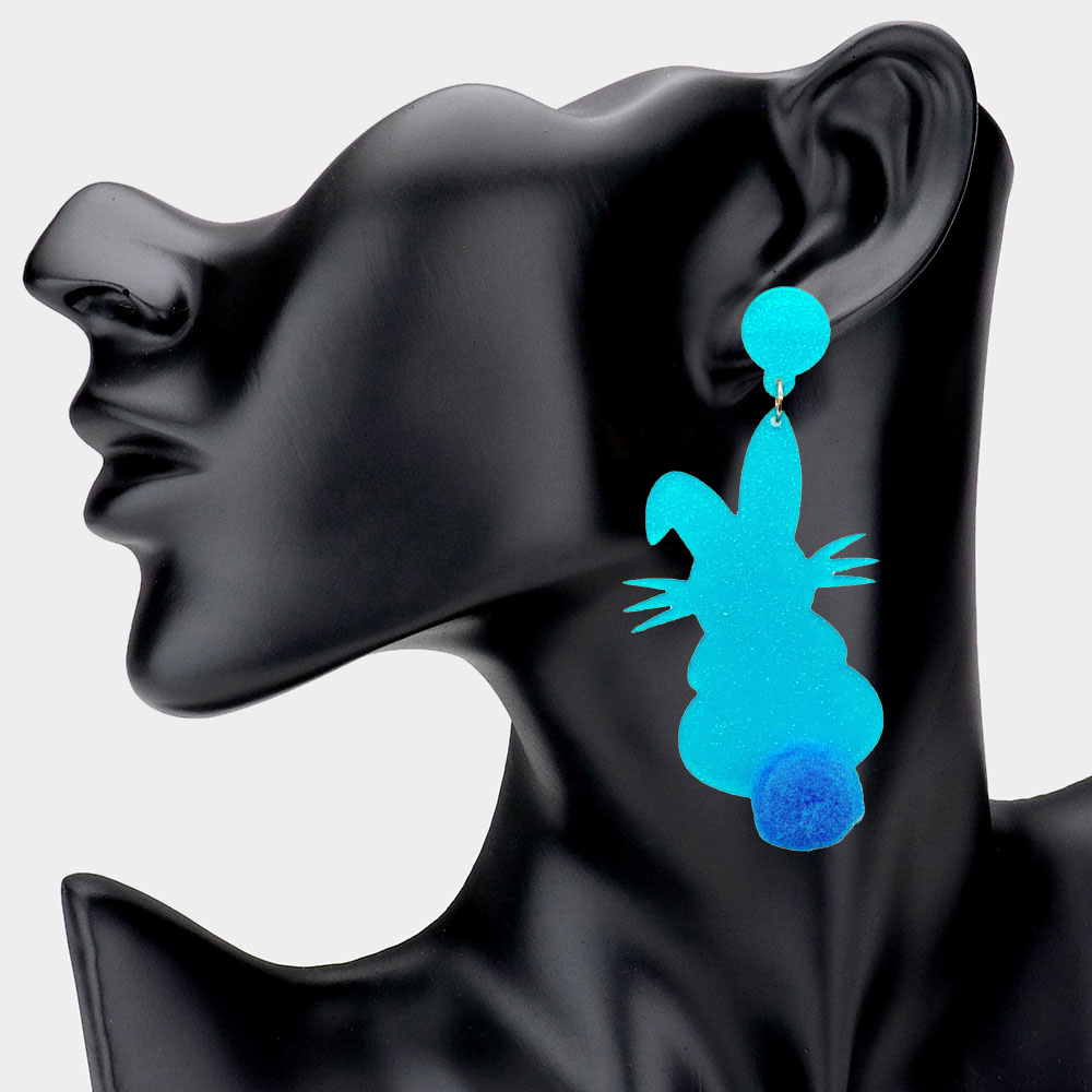 Glittered Resin Easter Bunny Pom Pom Tail Dangle Earrings