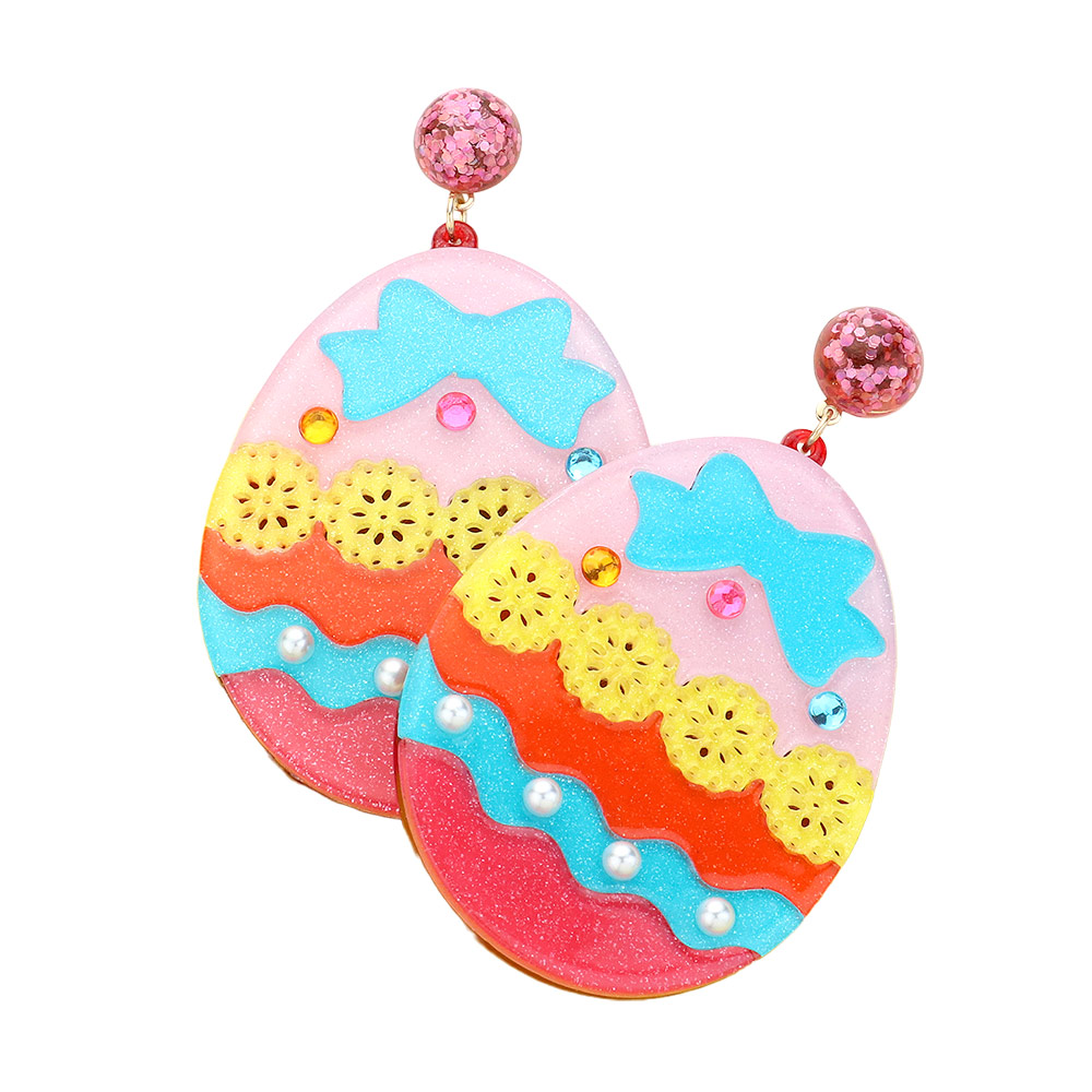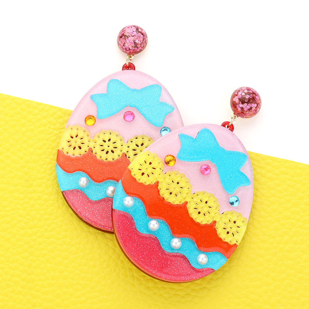 Faceted Beaded Bow Pointed Pom Pom Dangle Earrings