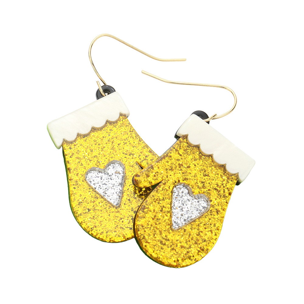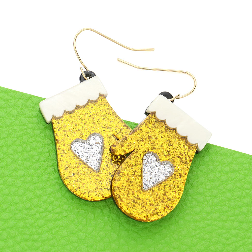 • Charming mitten-shaped hook earrings with glitter finish and heart detail, perfect for holiday wear. Lightweight and festive, ideal for seasonal events and cozy winter outfits.