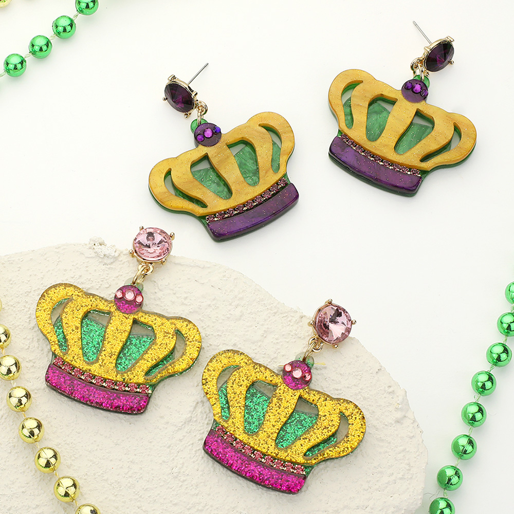 Glittered Resin Mardi Gras Crown Dangle Earrings