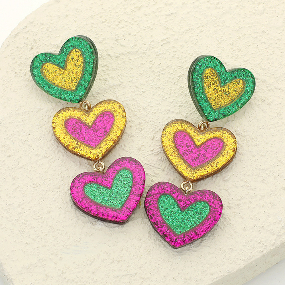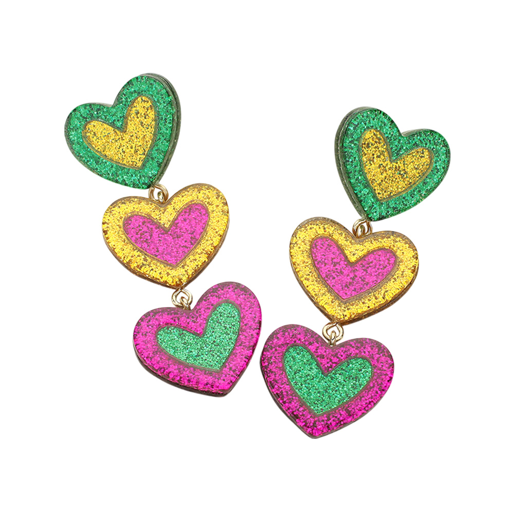 Glittered Resin Mardi Gras Triple Heart Link Dropdown Earrings