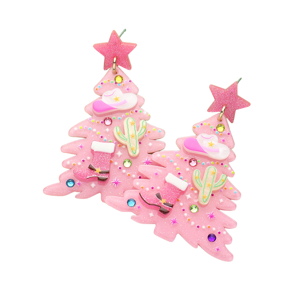 Glittered Resin Western Cowboy Christmas Tree Dangle Earrings