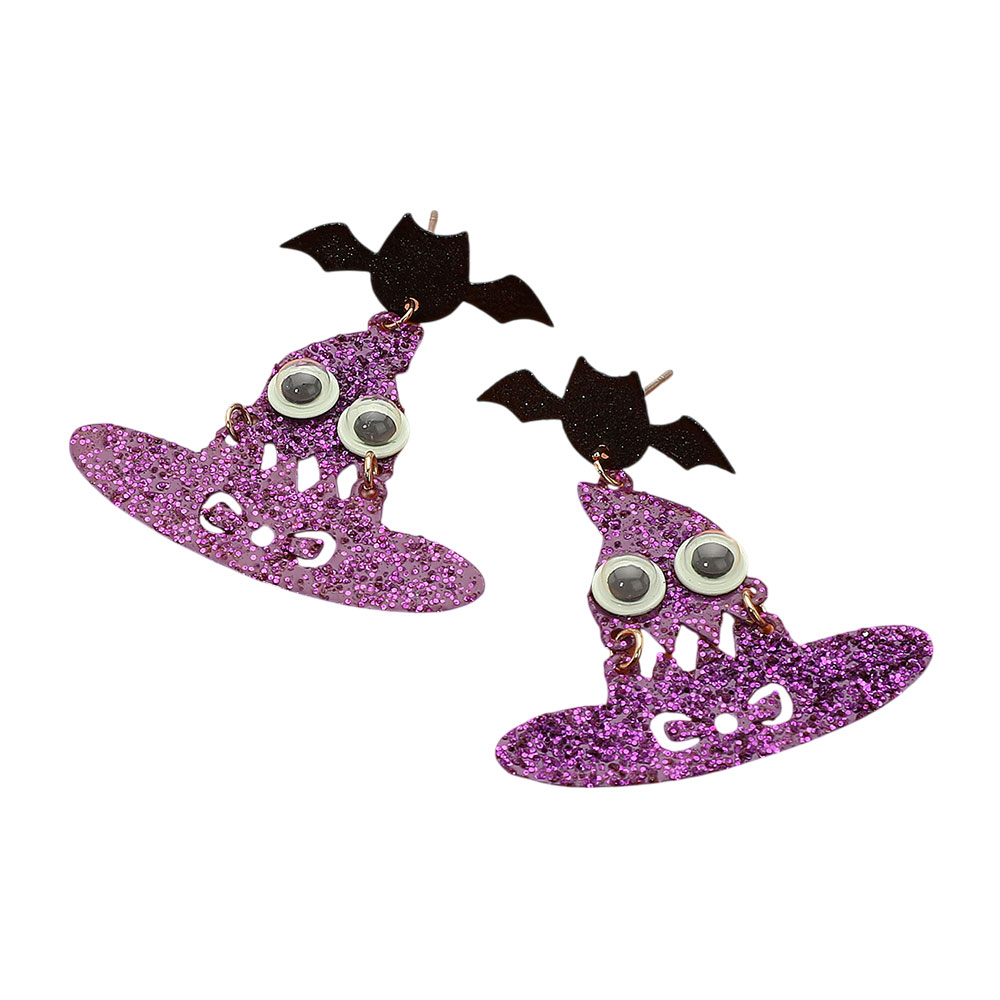 Details • Size : 1.5" X 1.6" • Post Back • Get into the spooky spirit with these witch hat earrings featuring googly eyes and glitter bats. Designed to glow in the dark, they’re the perfect fun accessory for your Halloween look. • Hypoallergenic • Lead and Nickel Compliant