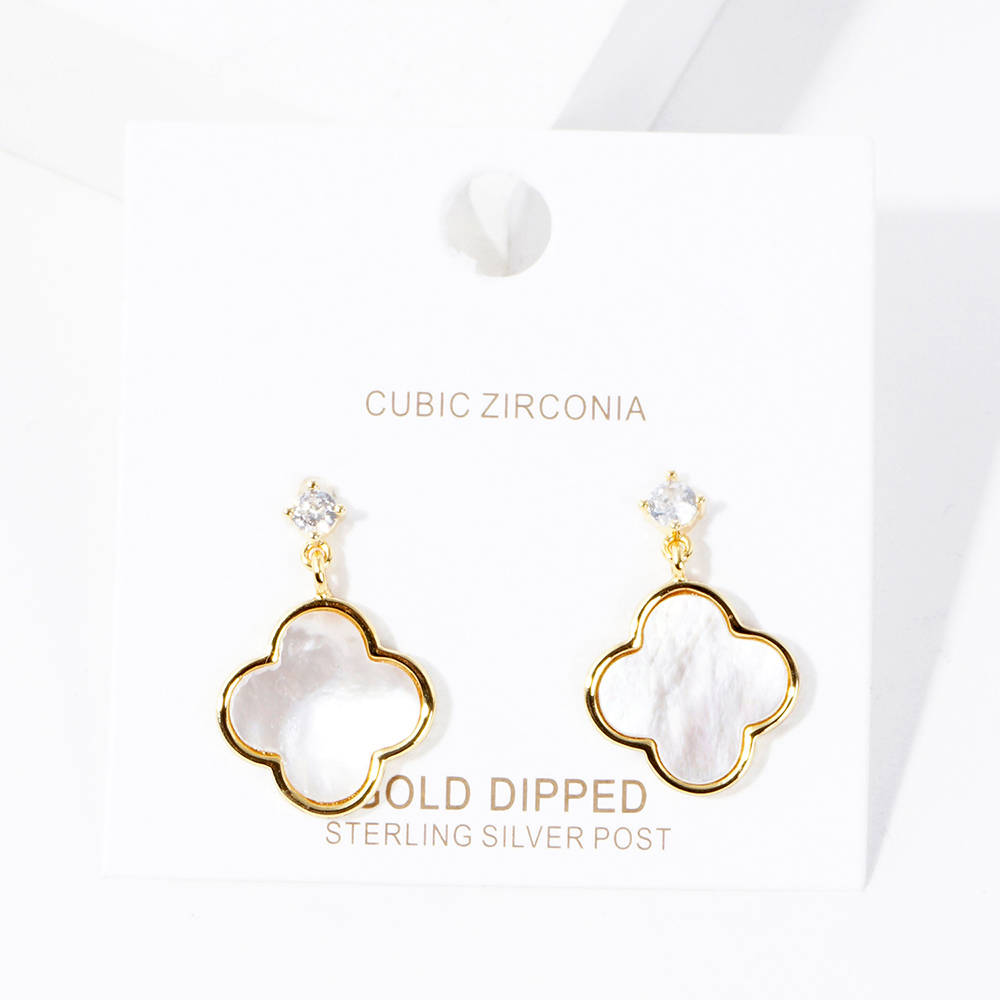 Gold Dipped CZ Mother of Pearl Quatrefoil Link Dangle Earrings