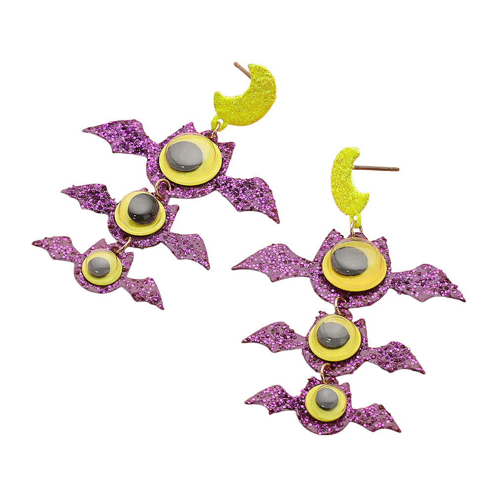 Details • Size : 1.5" X 2" • Post Back • Add spooky sparkle with bat and moon drop earrings! These Halloween accessories glow in the dark and feature fun googly eyes—perfect for costumes, parties, or festive flair. • Hypoallergenic • Lead and Nickel Compliant