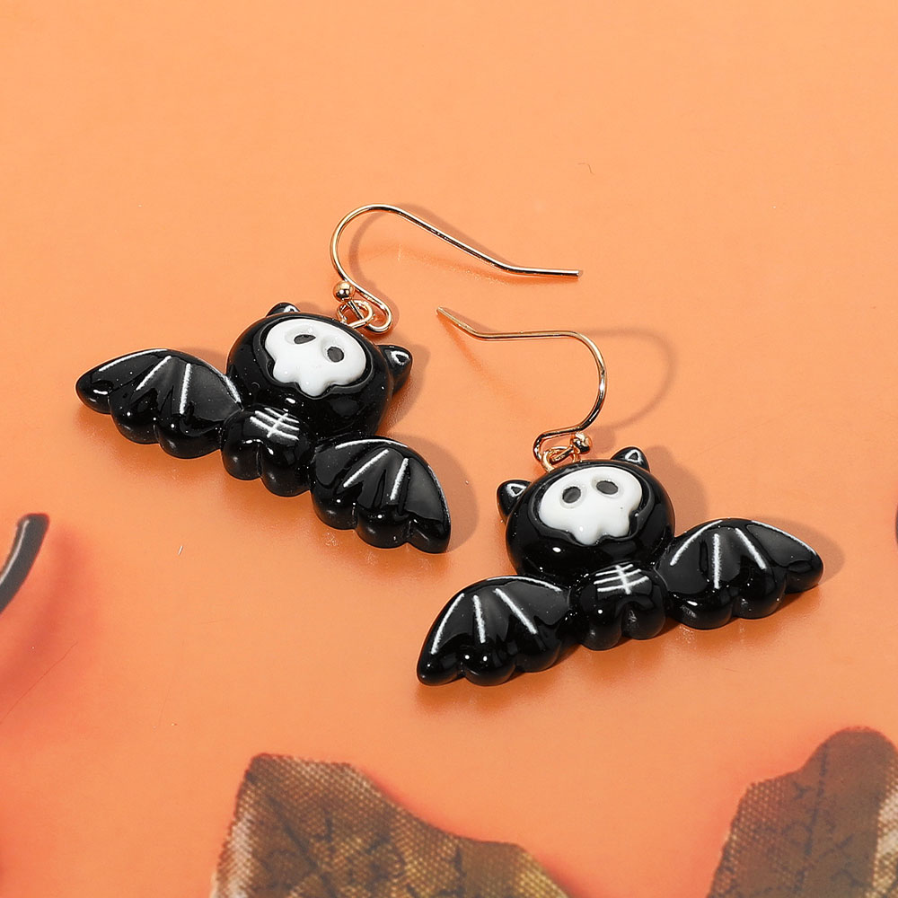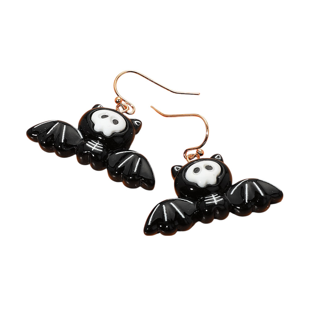 Details • Size : 1.4" X 1.25" • Fish Hook Back • Fly into spooky season with these bat skeleton Halloween earrings, featuring a cute black bat design with white skull face and rib detail. Lightweight and fun—perfect for costumes, parties, and Halloween accessorizing. • Lead and Nickel Compliant