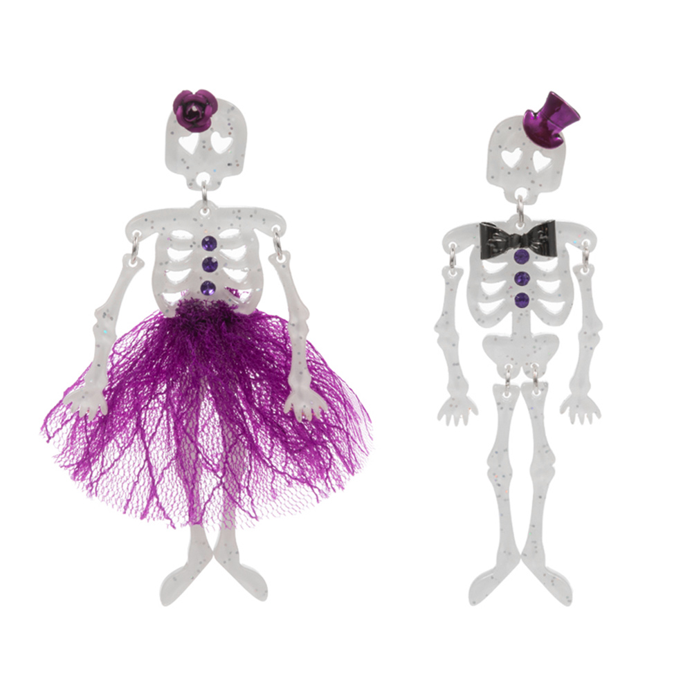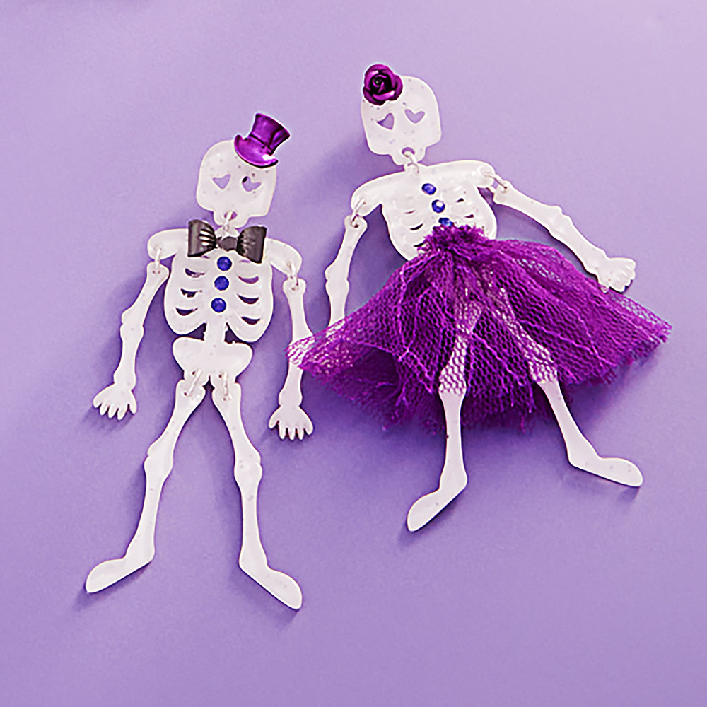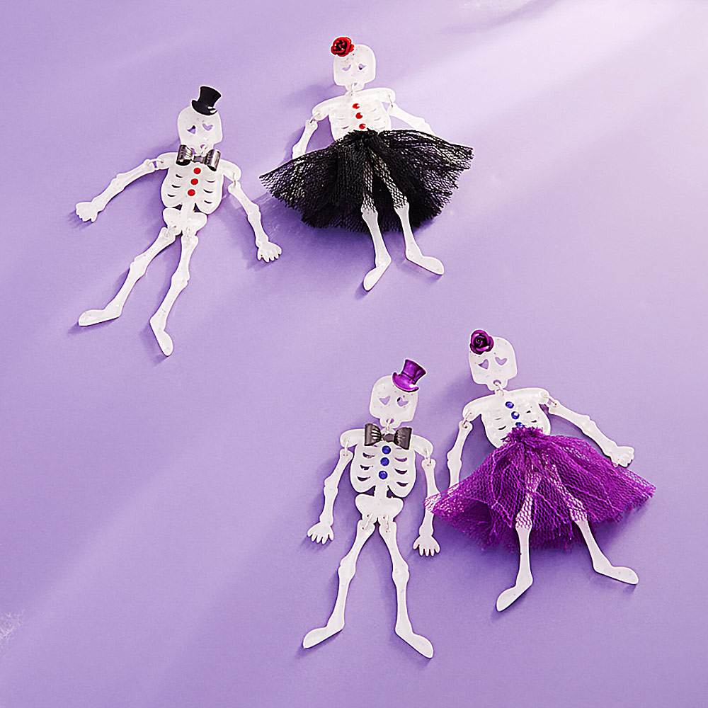 Details • Size : 1.5" X 3.1" • Titanium Post Back • Celebrate spooky season in style with these skeleton couple earrings featuring detailed characters dressed in a bow tie and tulle skirt. A fun and festive choice for Halloween parties, costumes, or adding a playful touch to your fall accessories. • Lead and Nickel Compliant • Hypoallergenic