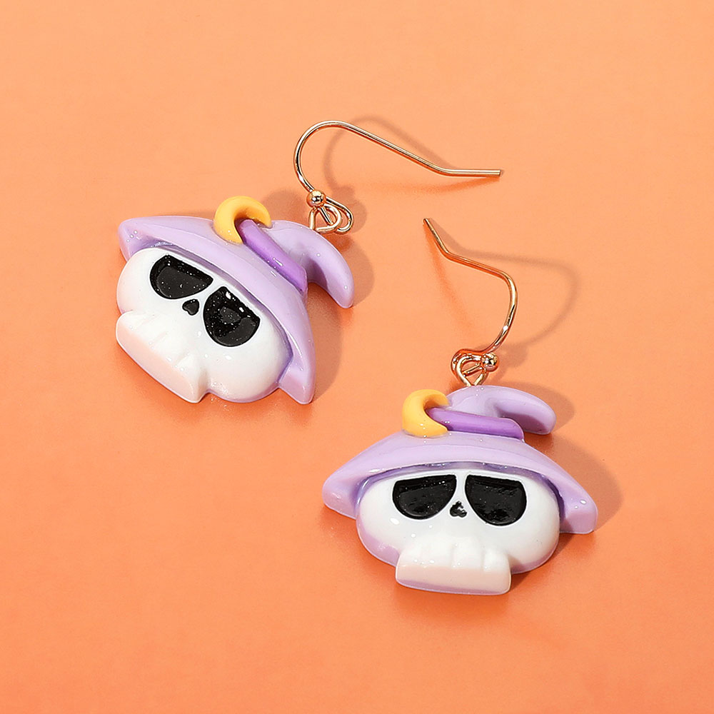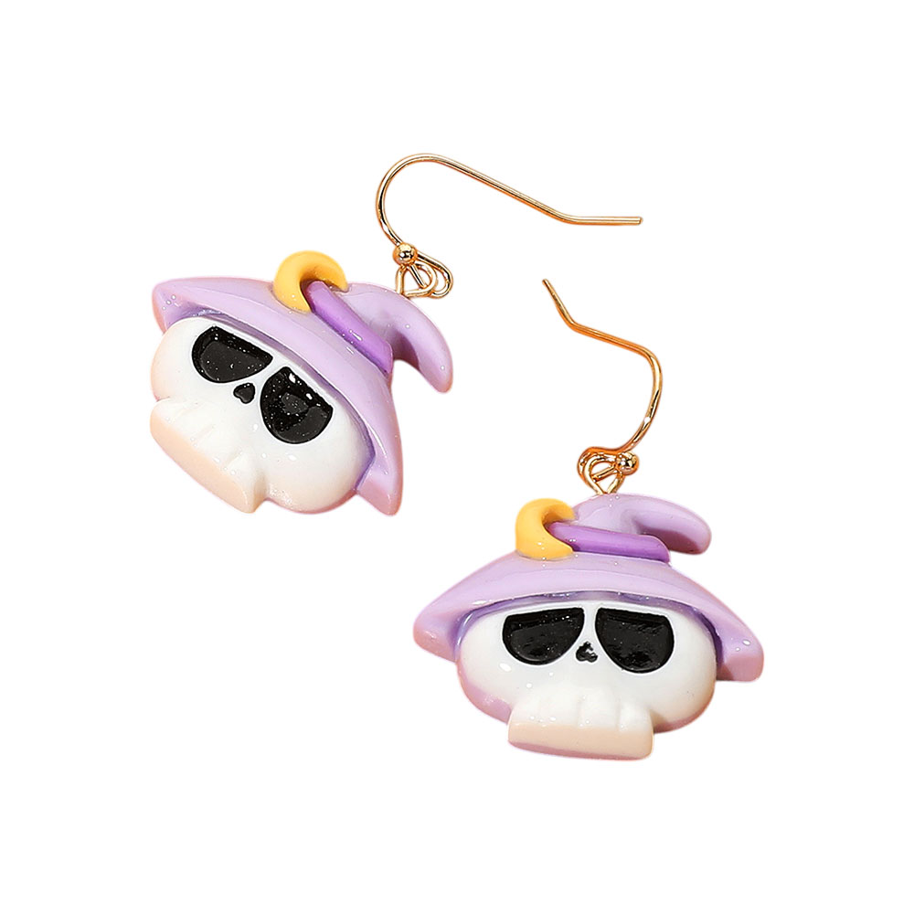Details • Size : 1.2" X 1.3" • Fish Hook Back • Add charm to your spooky style with these purple witch skull Halloween earrings, featuring a white skull with black eyes and a pastel witch hat. Lightweight and fun—perfect for Halloween parties, costumes, or playful fall fashion. • Lead and Nickel Compliant