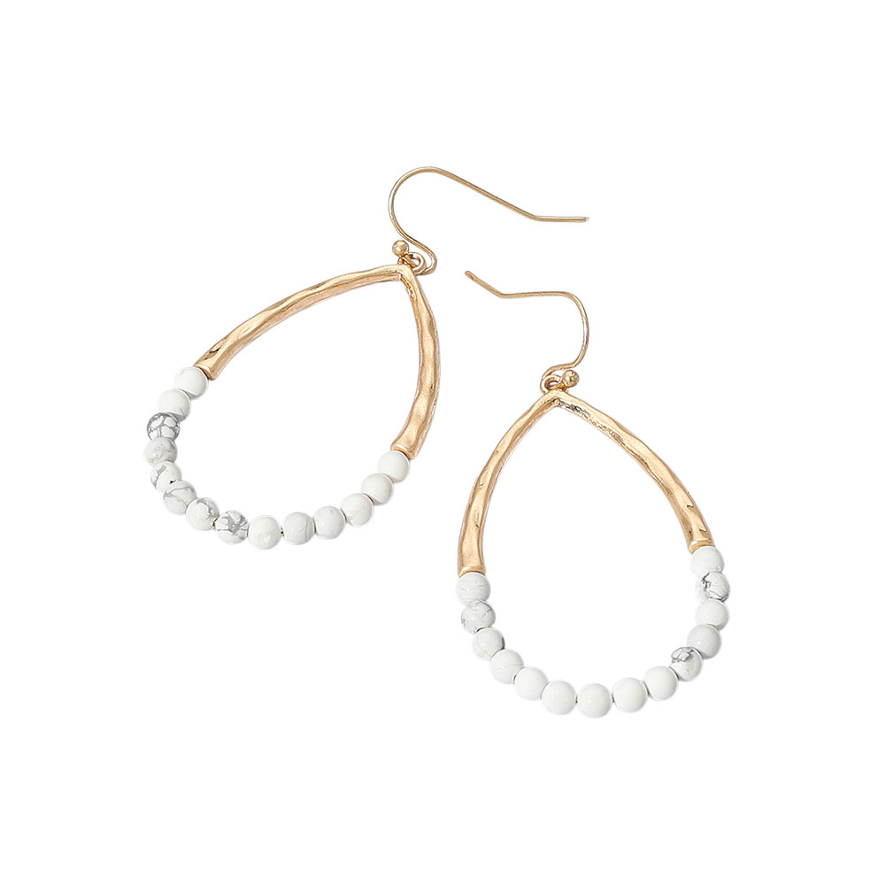 Hammered Metal Stone Beaded Open Teardrop Dangle Earrings