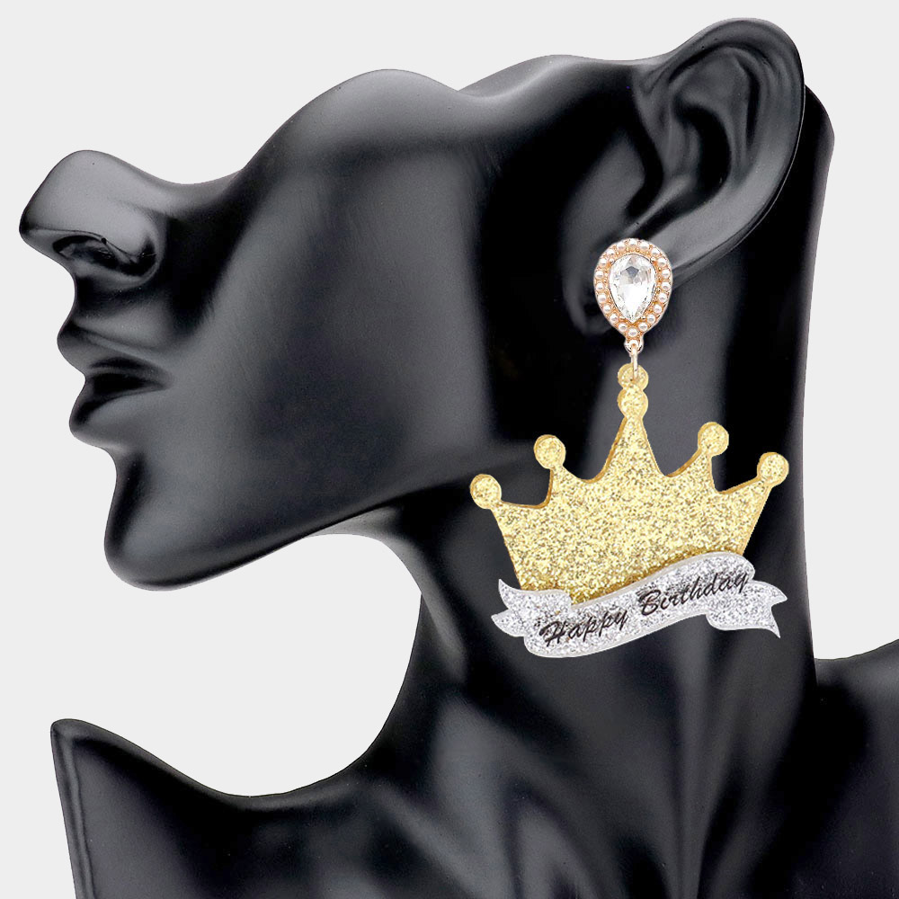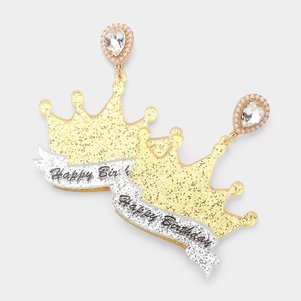 HAPPY BIRTHDAY Glittered Resin Crown Dangle Earrings