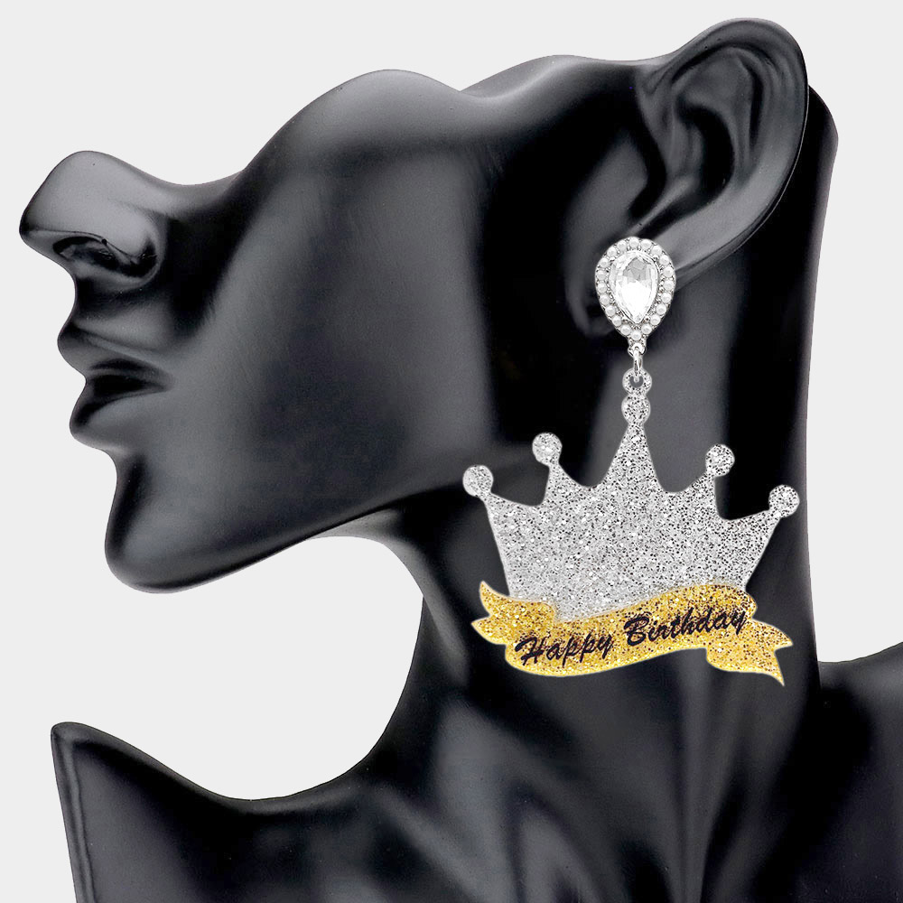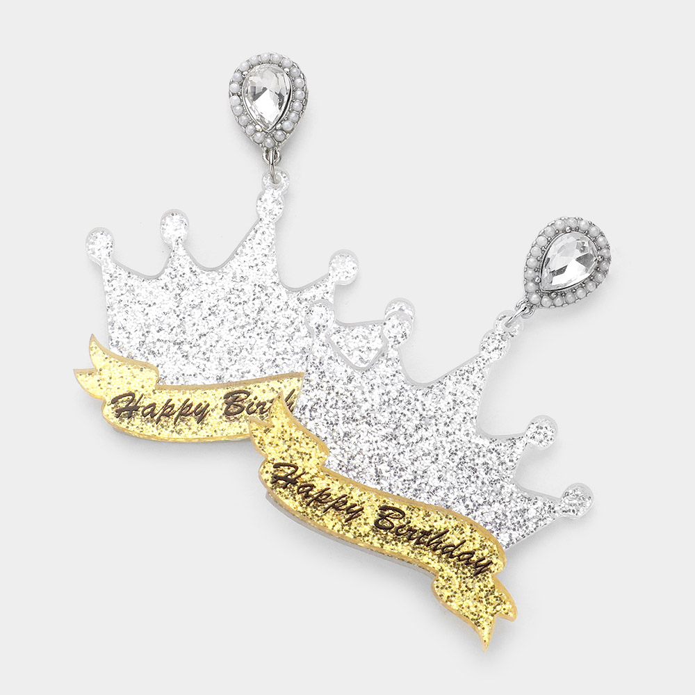HAPPY BIRTHDAY Glittered Resin Crown Dangle Earrings