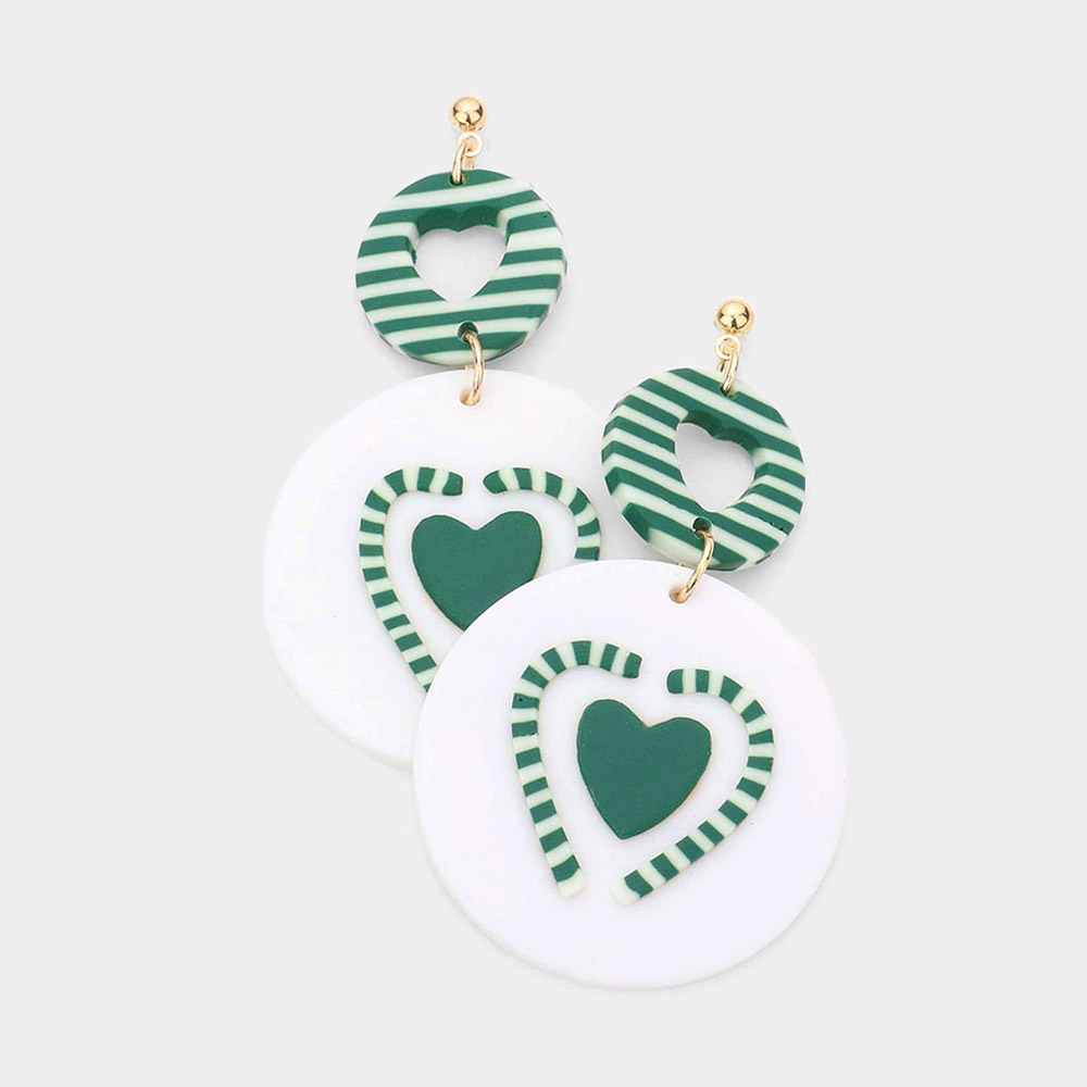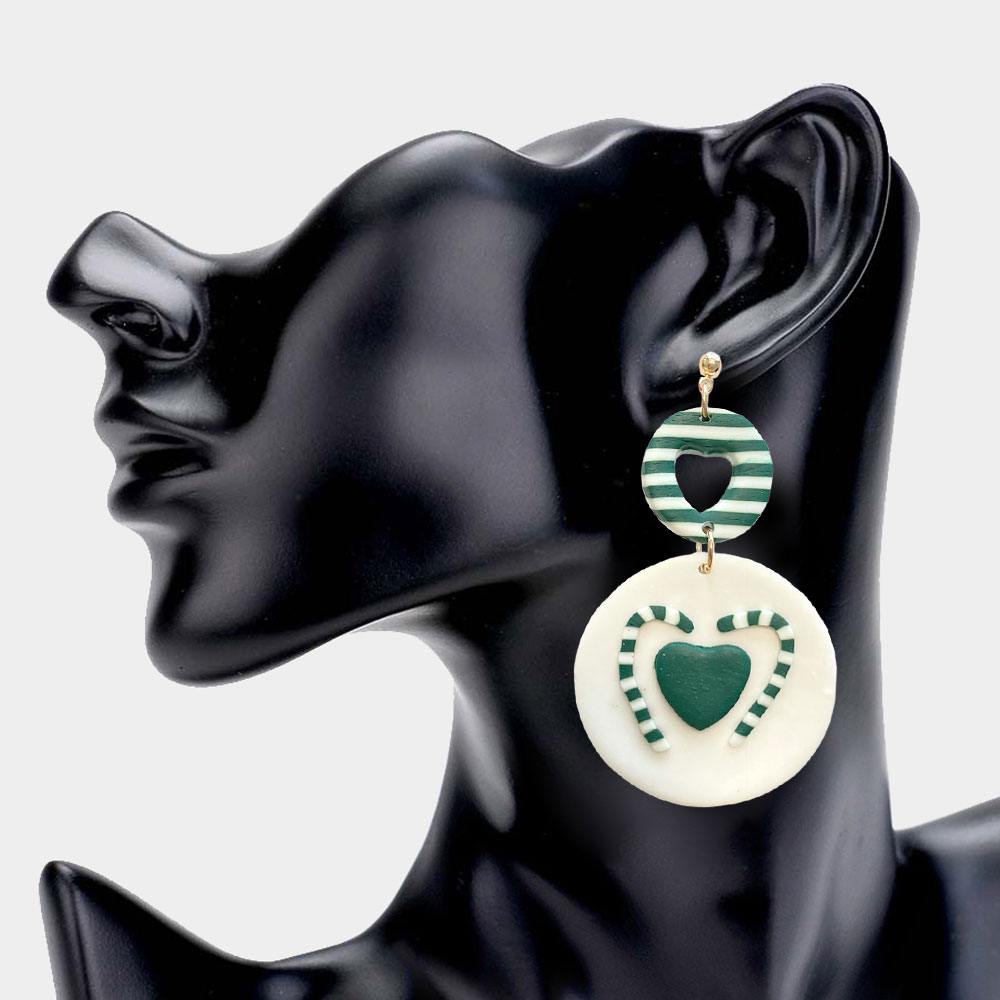 Heart Candy Cane Accented Round Polymer Clay Dangle Earrings