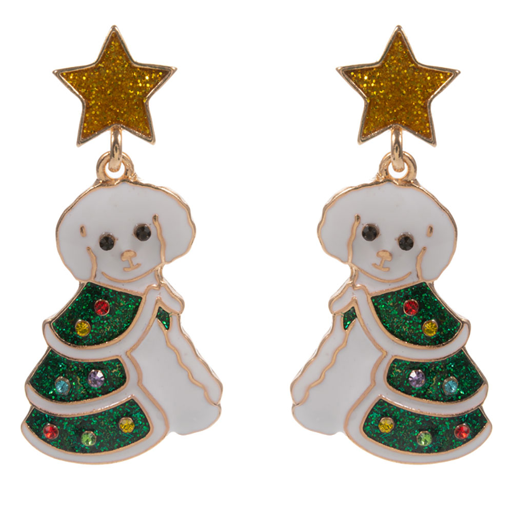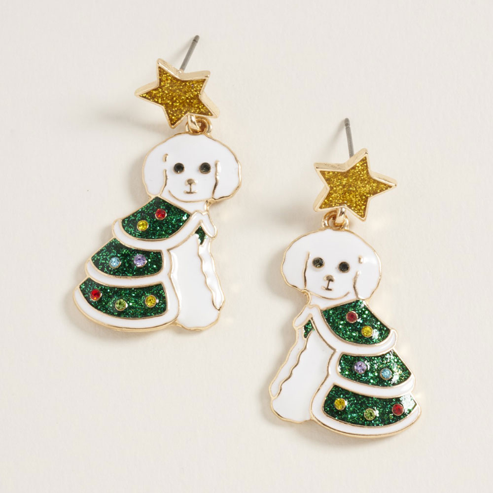 Details • Size : 0.8" X 1.7" • Titanium Post Back • Celebrate the season with these charming drop earrings featuring an adorable dog styled like a Christmas tree, topped with a glittering star. A perfect whimsical touch to any holiday outfit or festive occasion. • Lead and Nickel Compliant • Hypoallergenic