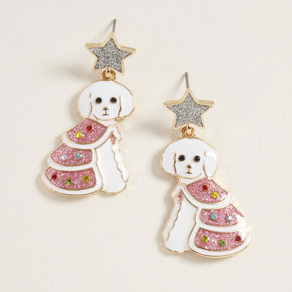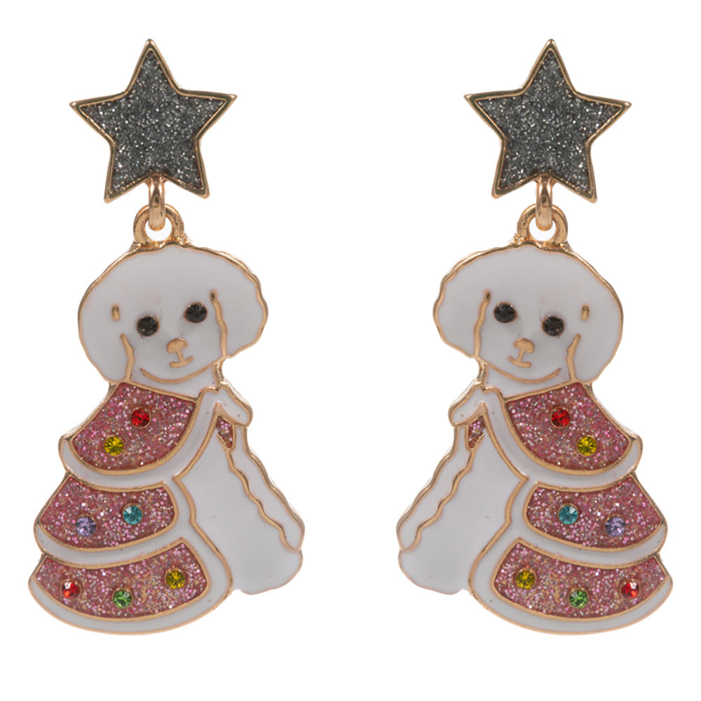 Details • Size : 0.8" X 1.7" • Titanium Post Back • Celebrate the season with these charming drop earrings featuring an adorable dog styled like a Christmas tree, topped with a glittering star. A perfect whimsical touch to any holiday outfit or festive occasion. • Lead and Nickel Compliant • Hypoallergenic