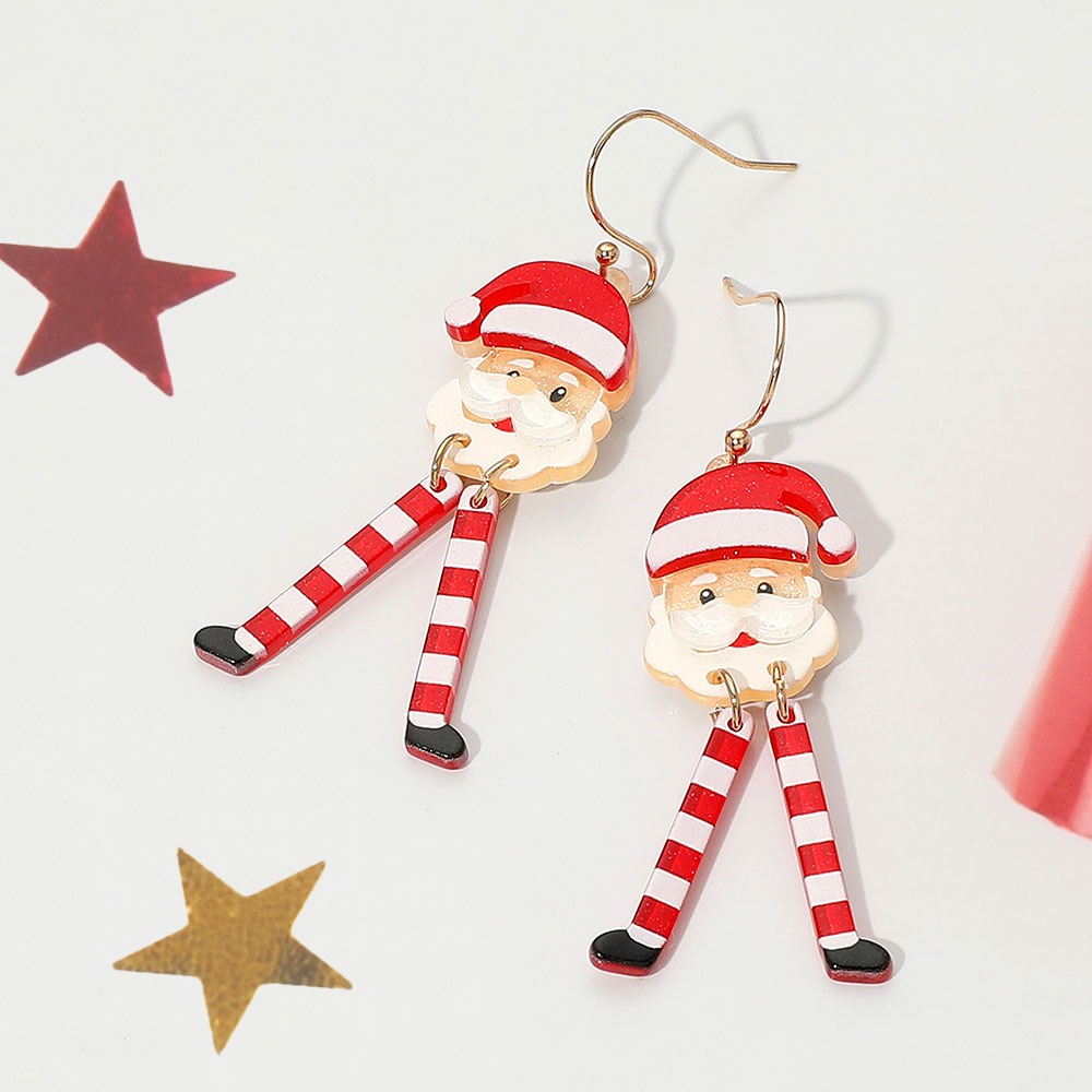 Details • Size : 0.7" X 2.4" • Fish Hook Back • Fun holiday earrings featuring jolly Santa Claus faces with striped dangling legs. A cheerful and whimsical accessory perfect for Christmas parties, gift exchanges, or festive winter looks. • Lead and Nickel Compliant