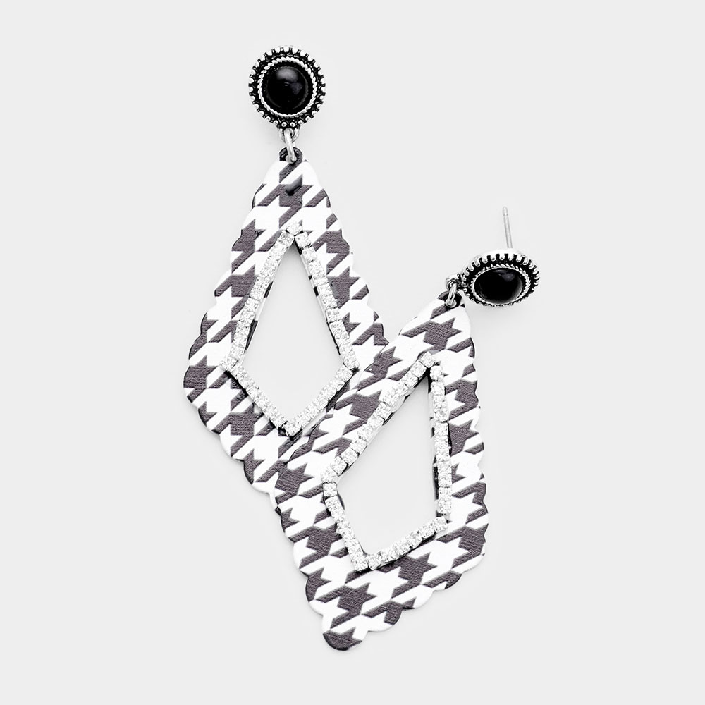 Houndstooth Check Print Rhinestone Embellished Cutout Geometric Metal Earrings