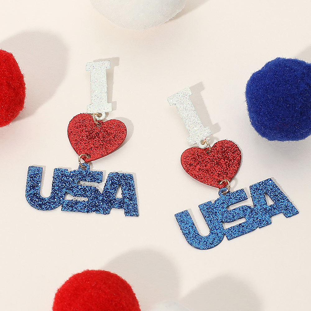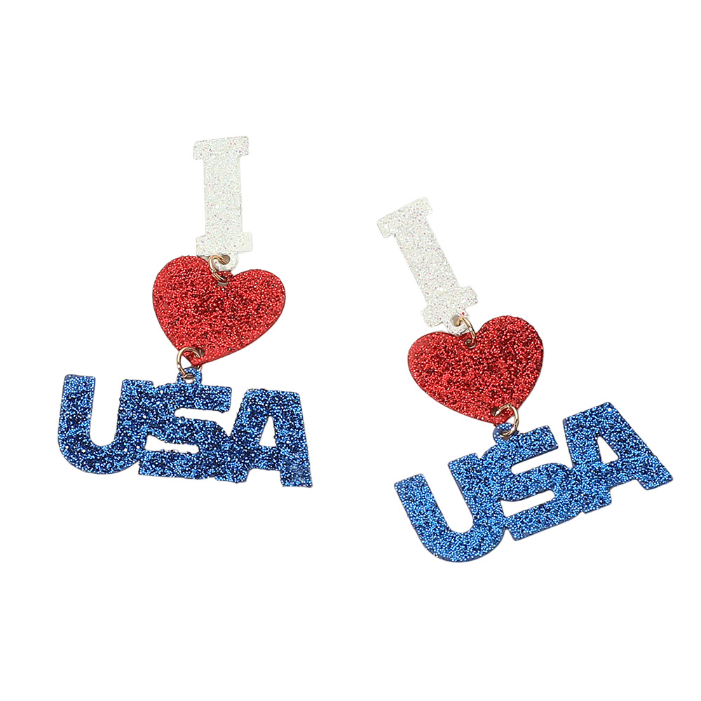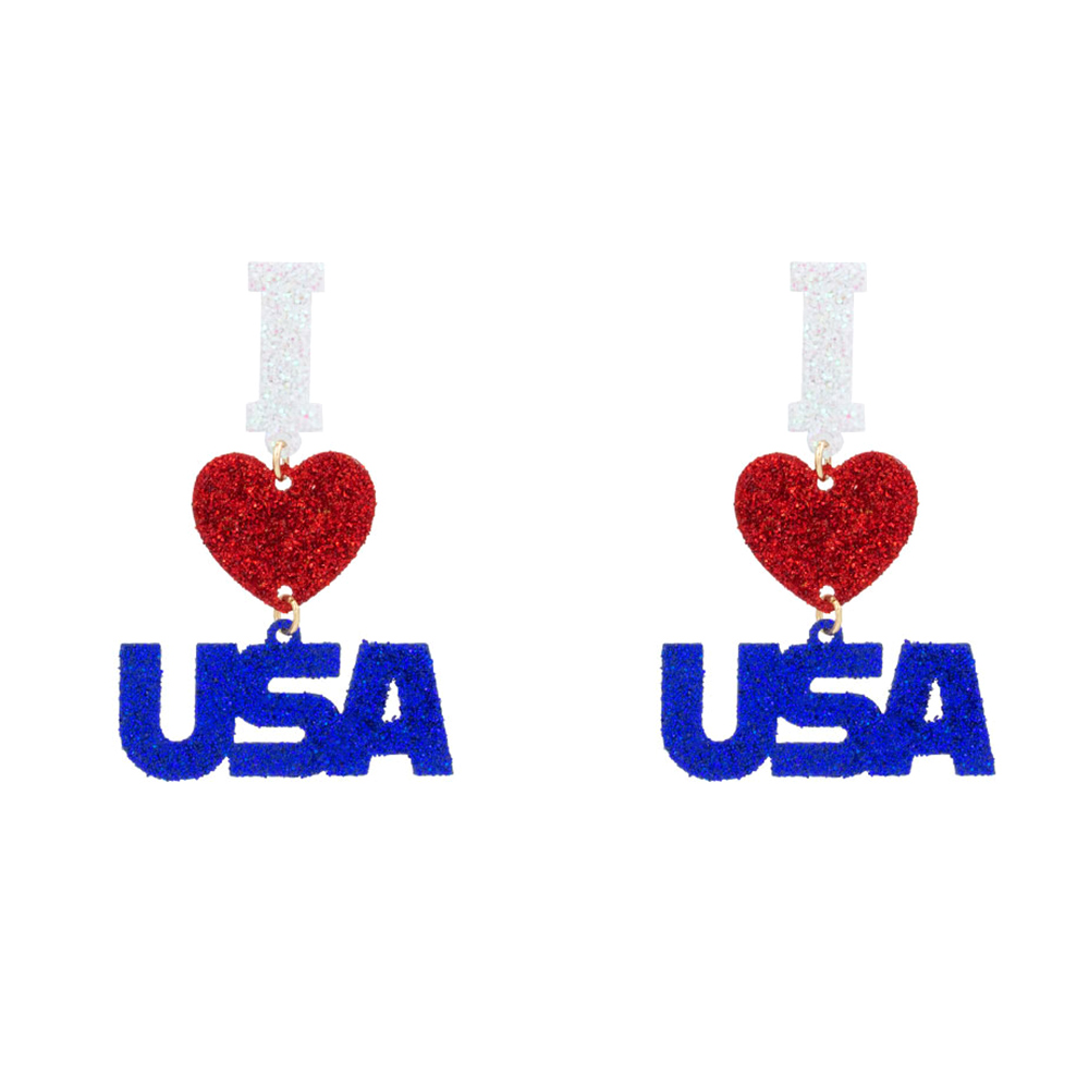 Enamel American USA Flag Heart Beaded Drop Chain Dangle Earrings
