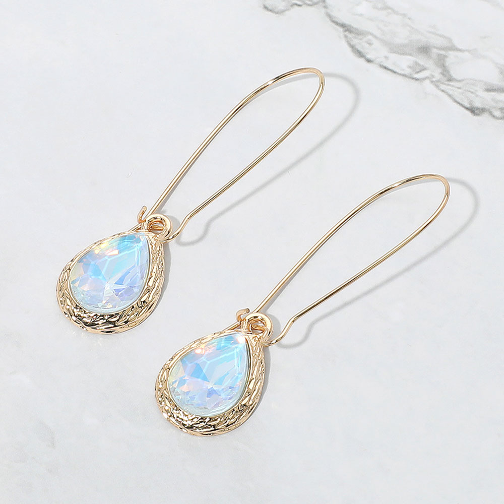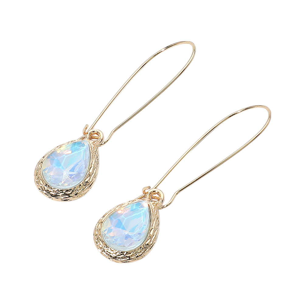 Details • Size : 0.6" X 2.25" • Kidney Ear Wire Back • Add a touch of elegance with these gold teardrop hook earrings featuring faceted iridescent crystals. Lightweight and eye-catching, they’re perfect for both casual wear and special occasions. The long wire hook design offers a modern twist on classic sparkle—ideal for weddings, parties, or everyday glam. • Lead and Nickel Compliant
