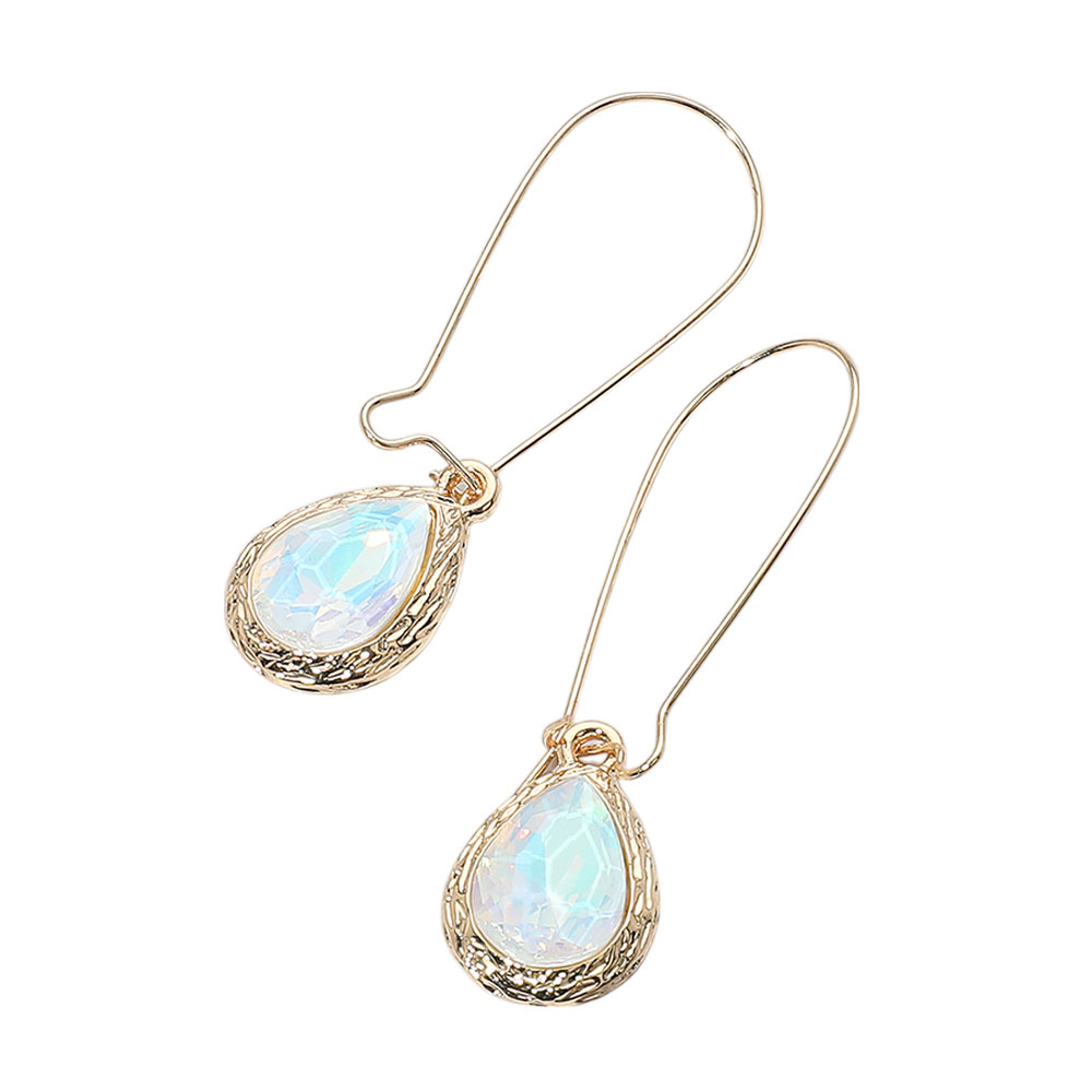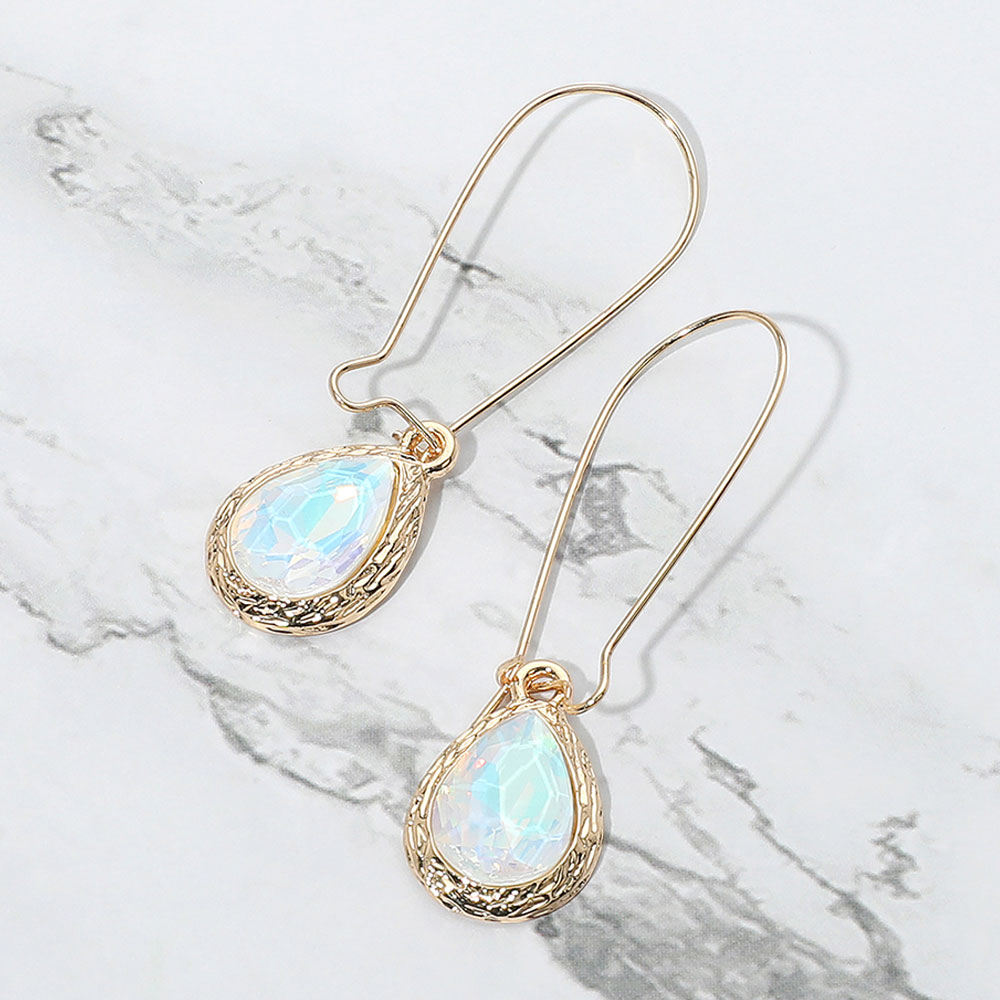 • Add a touch of elegance with these gold teardrop hook earrings featuring faceted iridescent crystals. Lightweight and eye-catching, they’re perfect for both casual wear and special occasions. The long wire hook design offers a modern twist on classic sparkle—ideal for weddings, parties, or everyday glam.